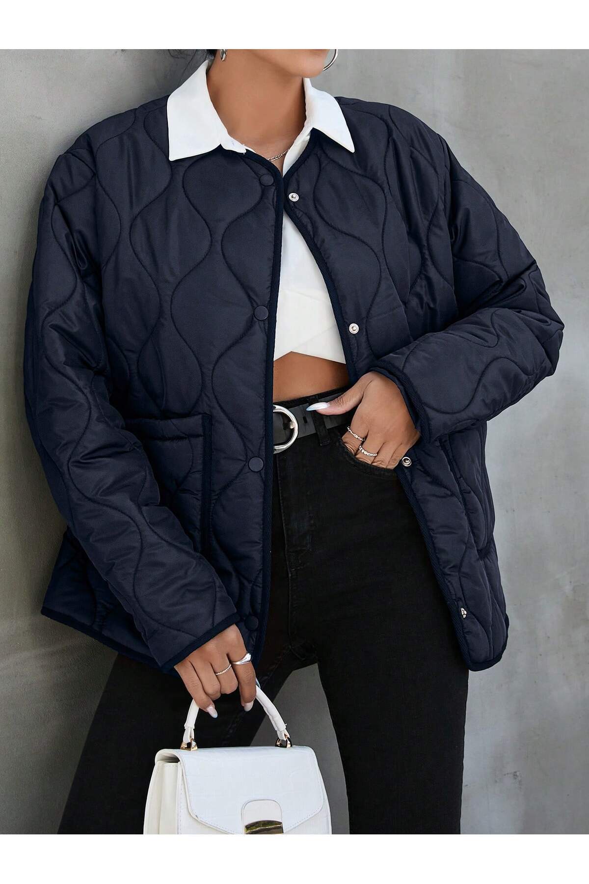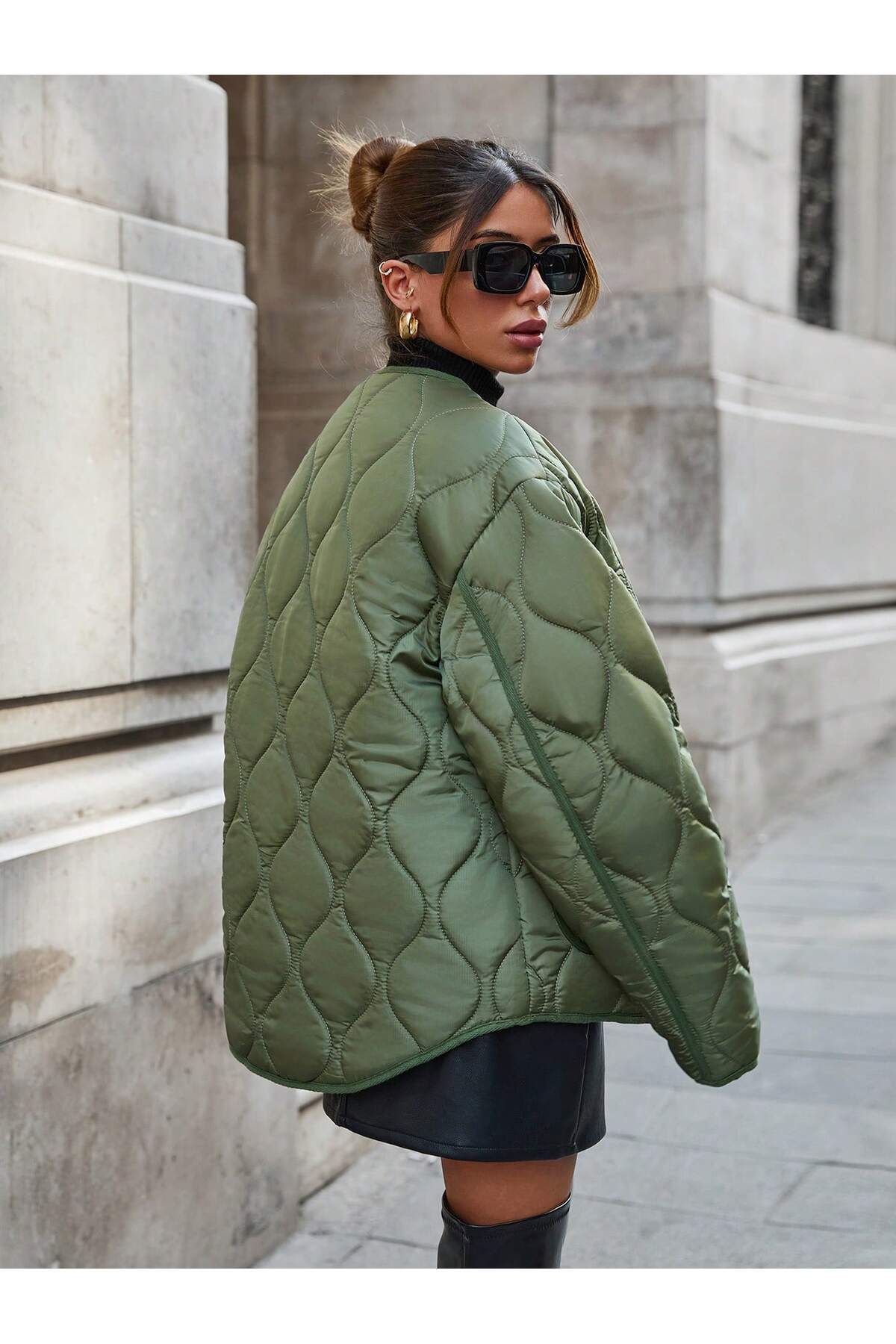 GENİŞ KALIP BALIK SIRTI BİYE AYRINTILI KAPİTONE MONT - Basic silueti ve koleksiyonuyla her yaş grubuna hitap eden geniş kalıp kapitone mont, günlük kullanım için idealdir