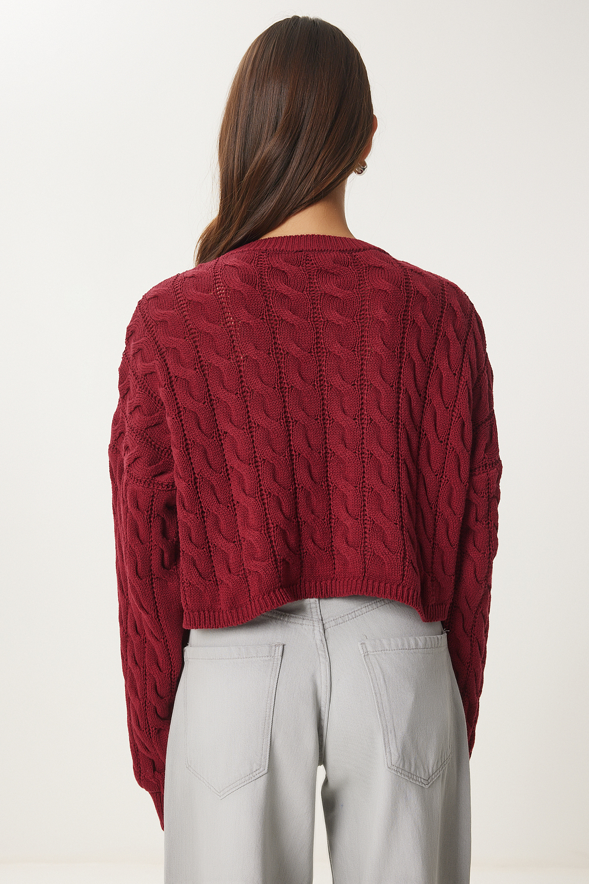 Uzun kollu, esnek yapılı, düşük omuzlu, bisiklet yaka örgü motifli triko kazak.