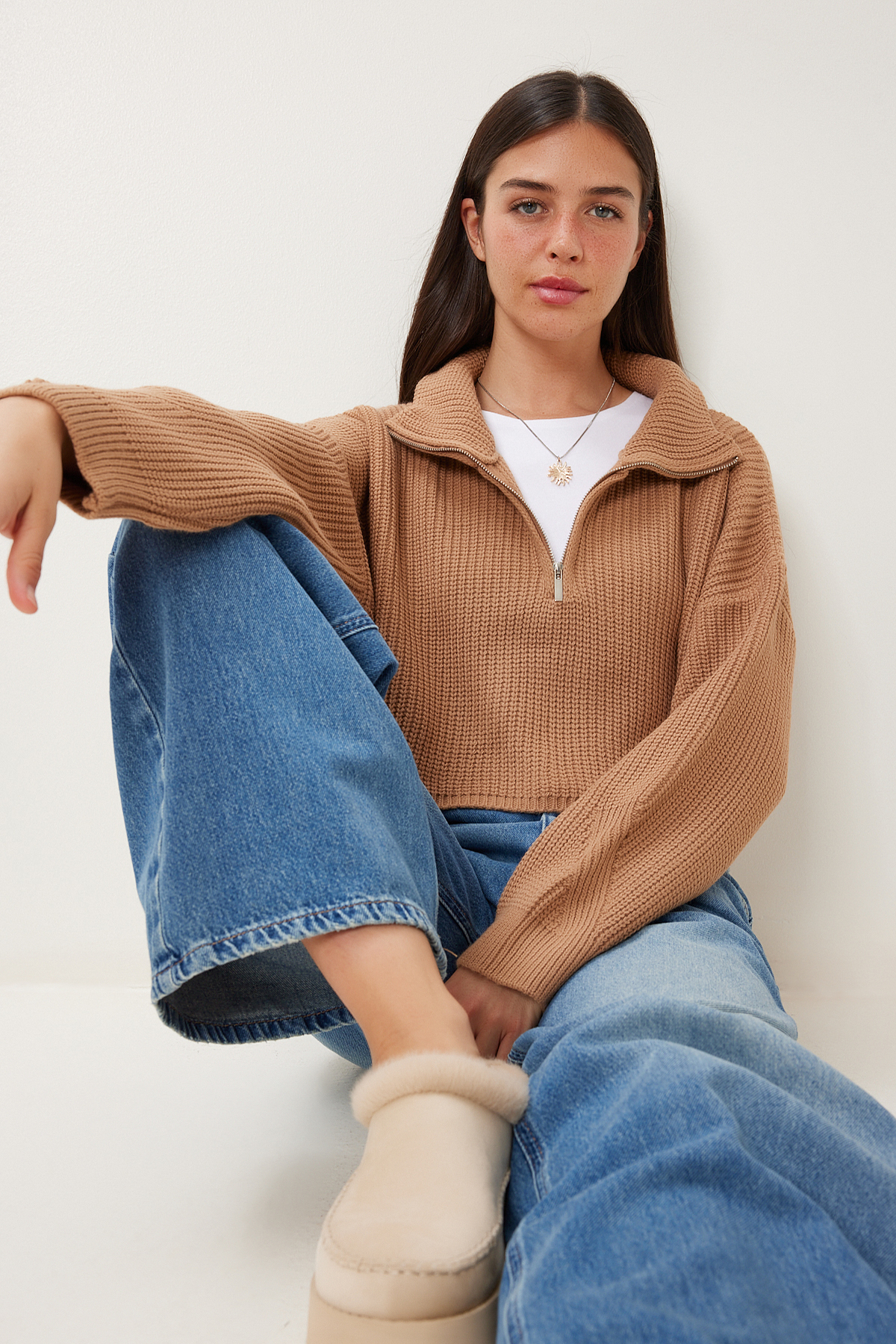 • Fermuarlı balıkçı yaka, düşük omuzlu, kısa, likralı, esnek yapılı triko kazak
