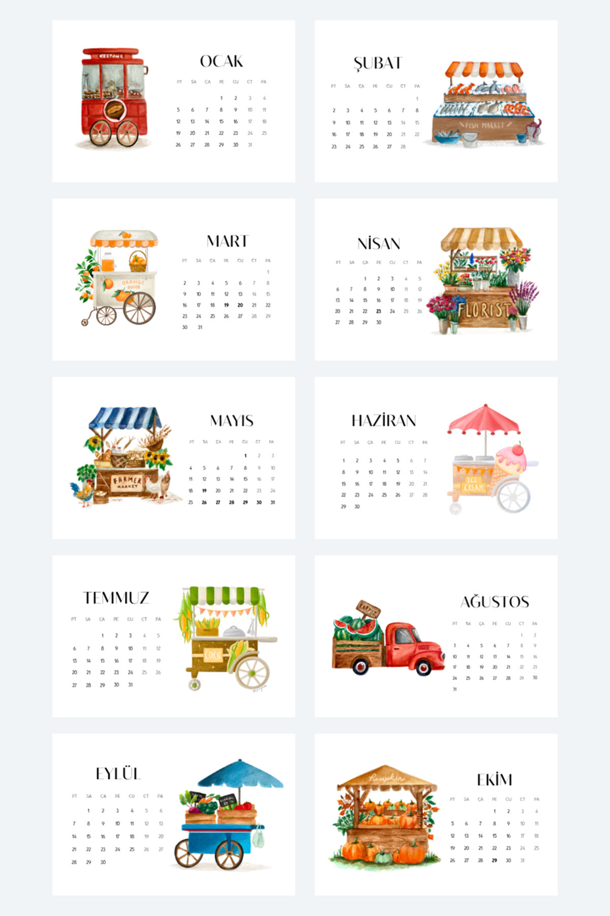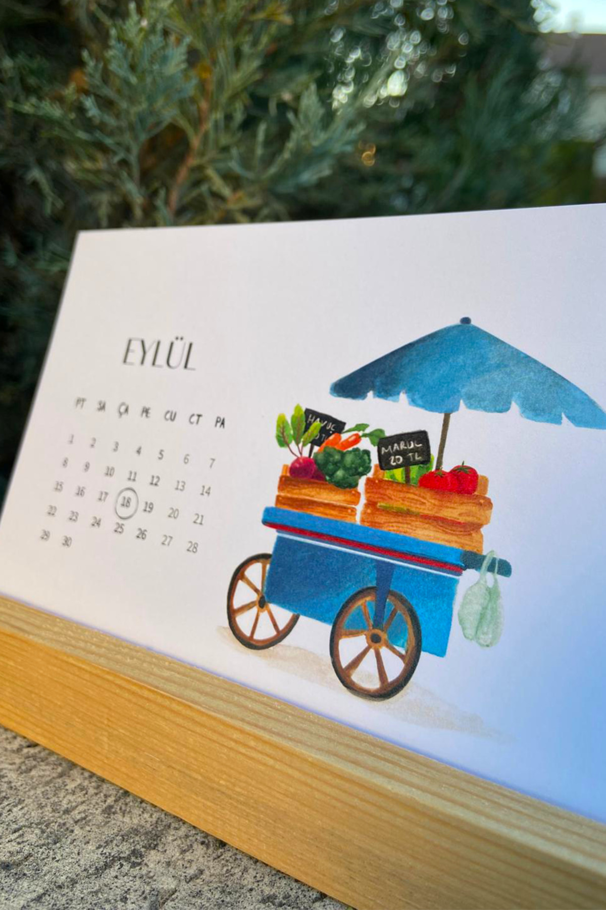 Özel Tasarım 2026 Masa Takvimi | Suluboya Illüstrasyon | Ahşap Tutacaklı Pazar Lezzetleri Takvimi