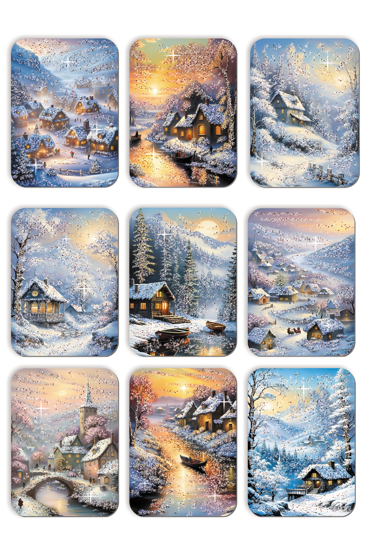 -9 adet 350 gr 1.hamur özel kağıda yüksek kalite basılmış simli kartpostallar yılbaşı, christmas, postcard, noel, postcrossing, snow, hediye kart, tebrik kartı giftcard, greetings card -Ölçüler : 11 Cm x 15 Cm -Arkasındaki şablonu doldurup pulunuzu yapıştırıp sevdiklerinize kucak dolusu kartlar yollayabilirsiniz -İsterseniz de dekoratif amaçlı evinizde sergileyin -Bu yıl nostalji olsun derseniz yeni sezon Mia Pera kartpostalları tam sizlik -Desenler tamamen Mia Pera ya aittir tüm hakları saklıdır