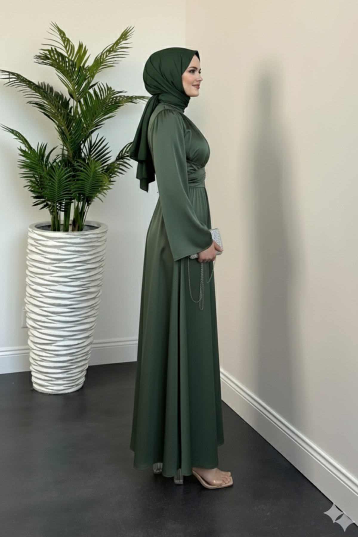 - Uzun boyu ile tesettür giyim standartlarına uygunluk gösterir.