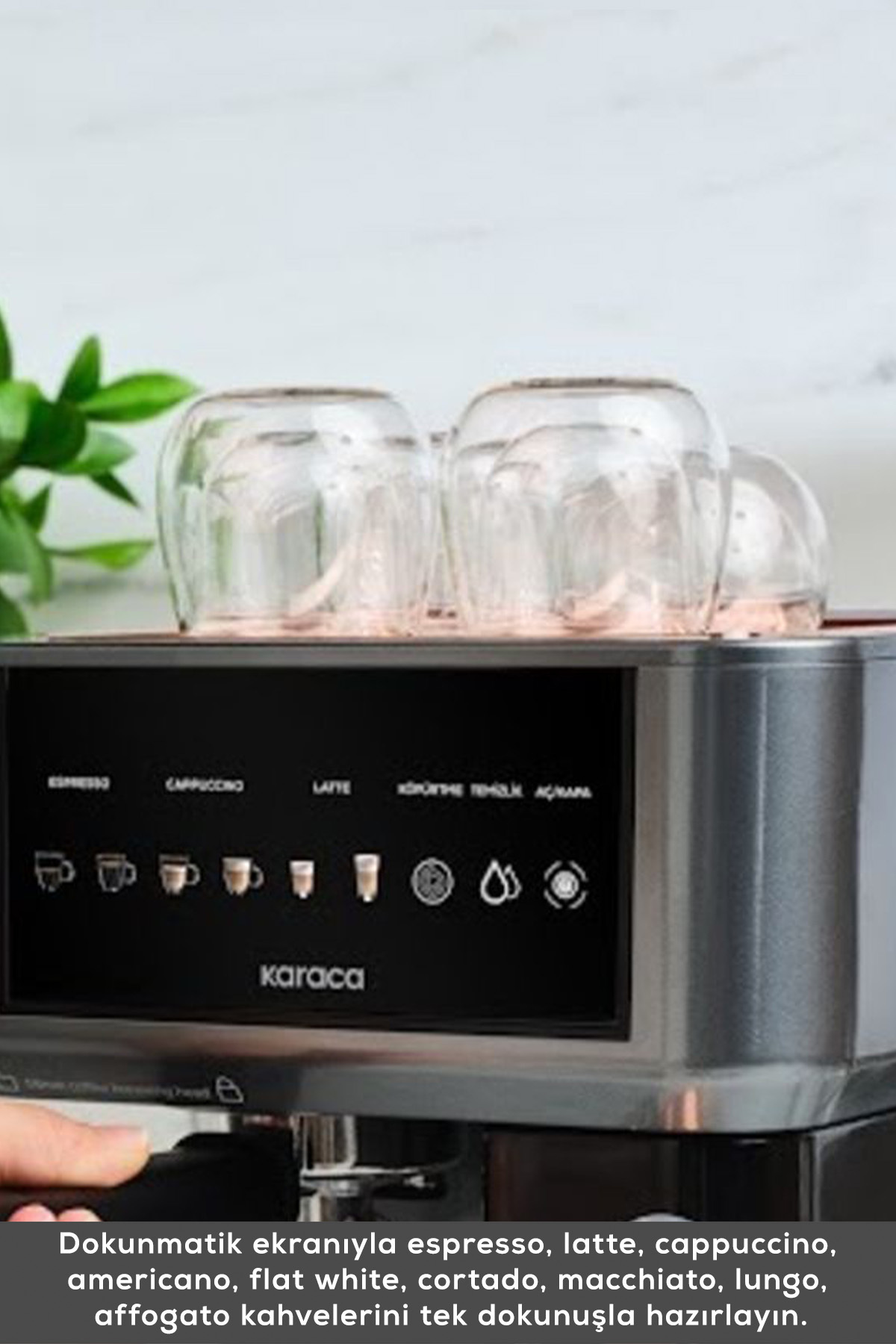 Karaca MyCaffe Barista S10 Otomatik Espresso Makinesi, ile espresso, latte, cappuccino, americano, flat white, cortado, macchiato, lungo, affogato gibi kahveleri tam kıvamında hazırlayabilirsiniz.