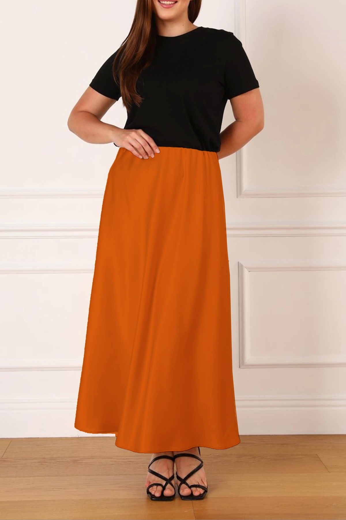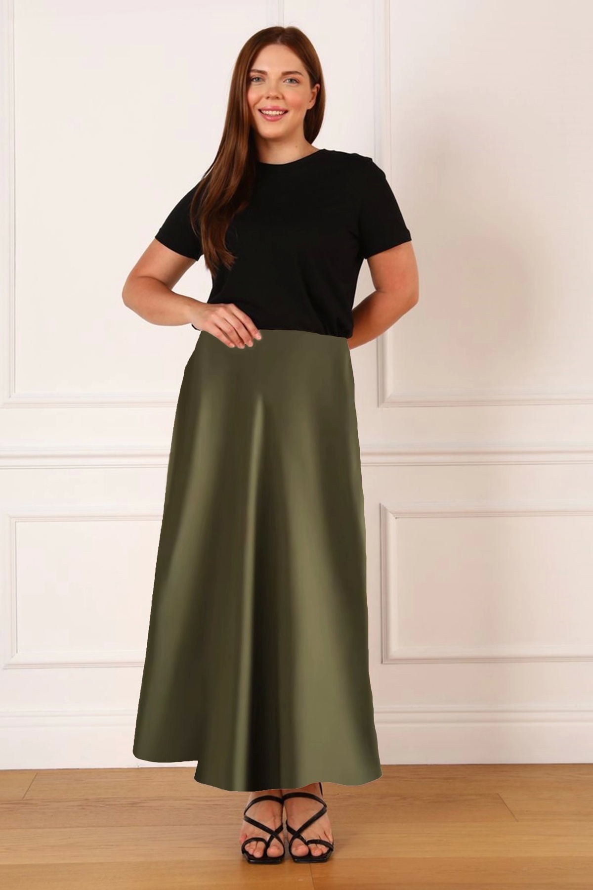 Büyük Beden Lastikli Fermuarlı Saten Kloş Uzun Etek 44 Beden Boy: 96 cm Bel: 92 cm ( Lastik esnemiş hali ile )
