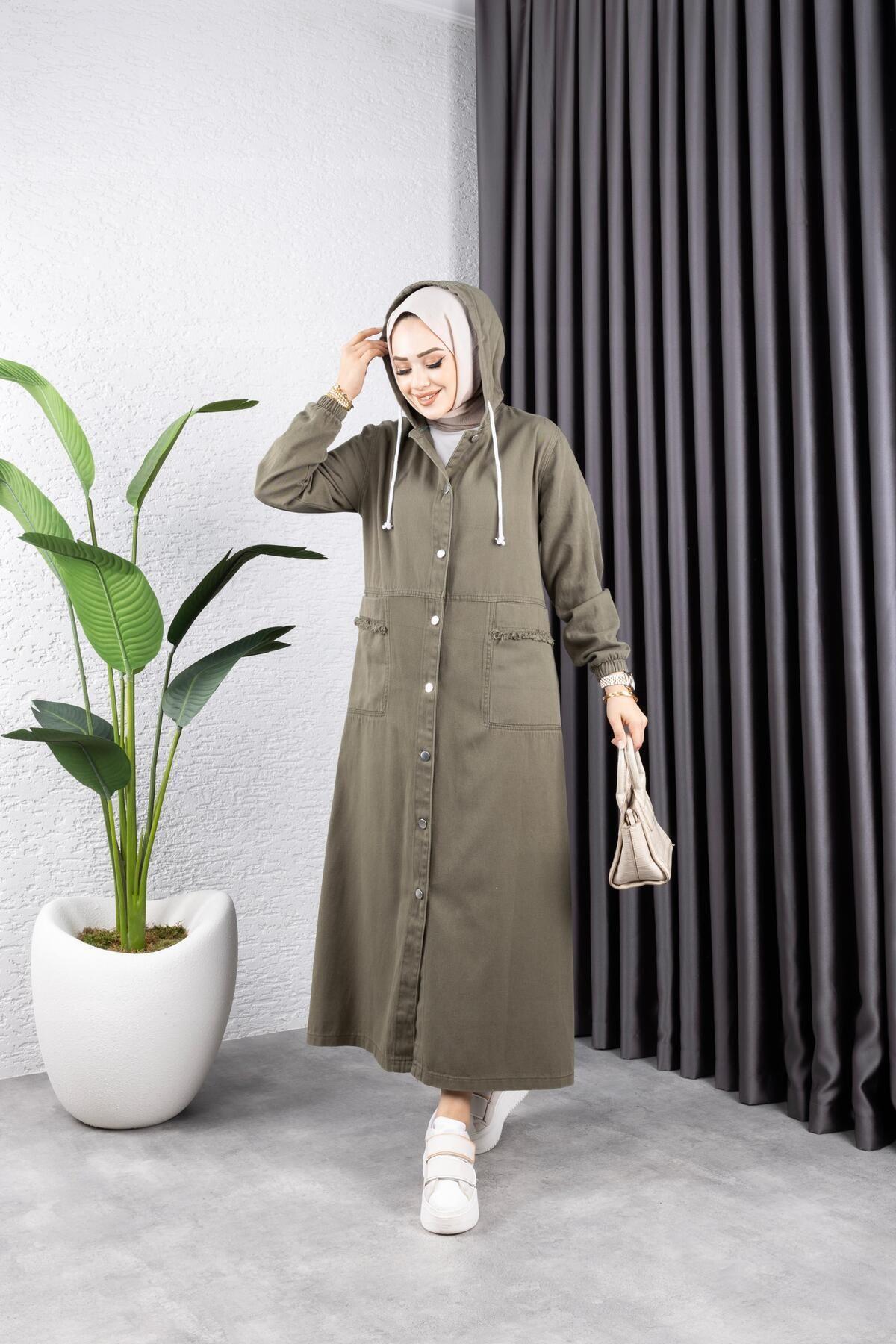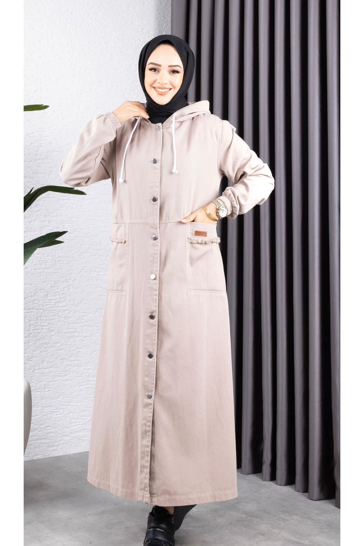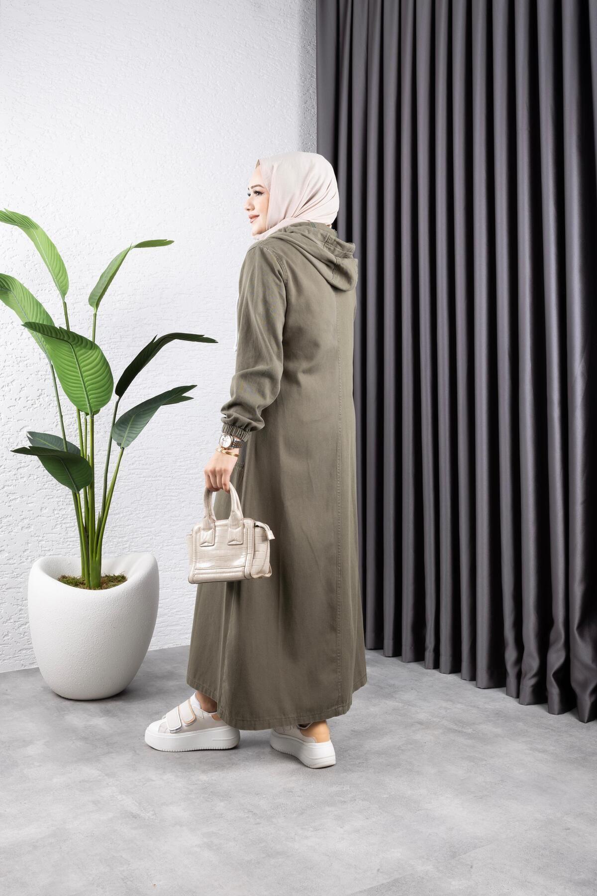 - Tesettür giyim koleksiyonunun şık bir parçası olarak tasarlanmış, her yaş grubuna hitap eden uzun siluetiyle dikkat çeken kot kapüşonlu ceket.