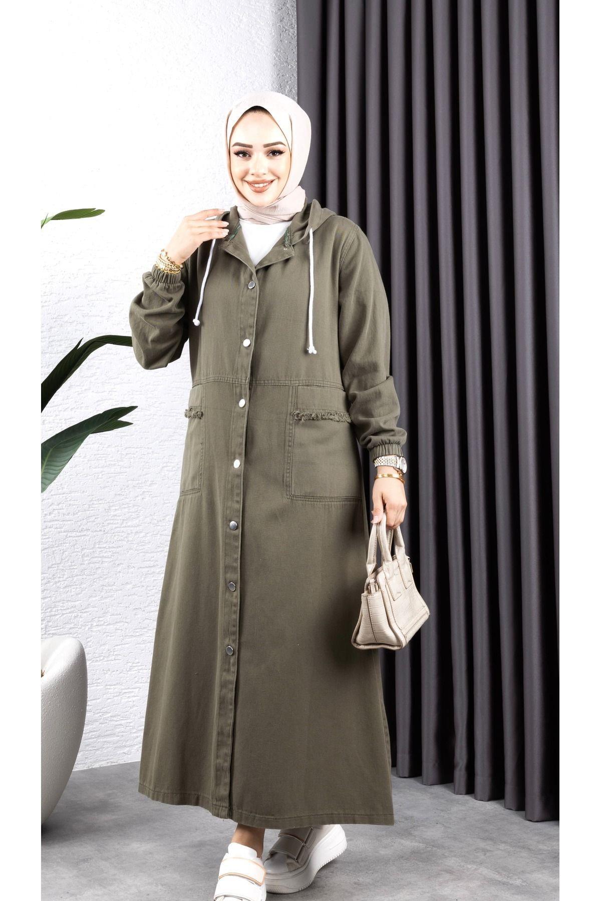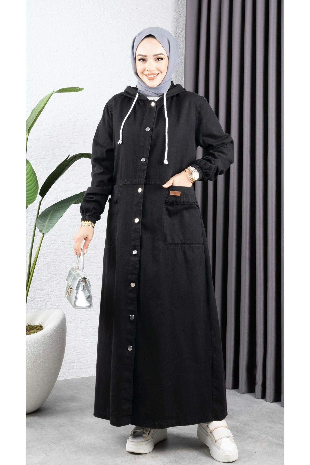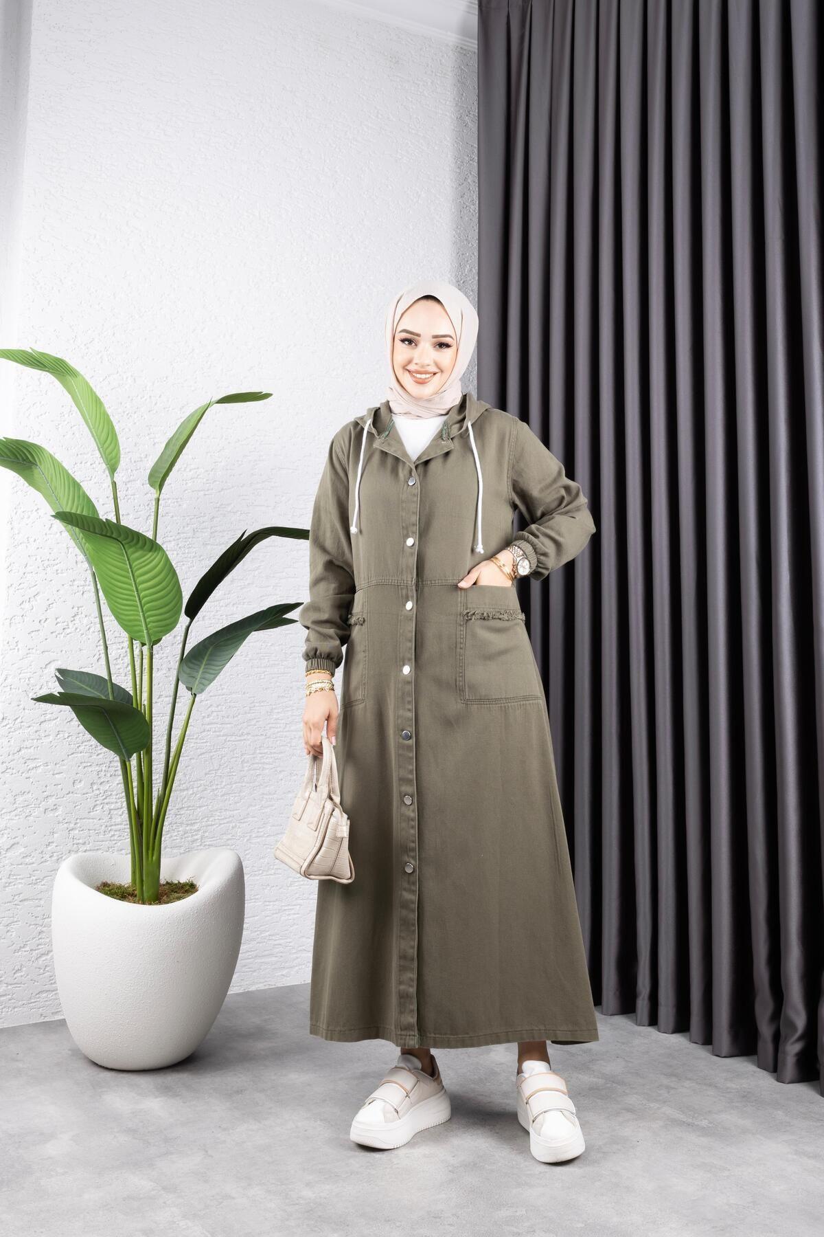 - Tesettür giyim koleksiyonunun şık bir parçası olarak tasarlanmış, her yaş grubuna hitap eden uzun siluetiyle dikkat çeken kot kapüşonlu ceket.