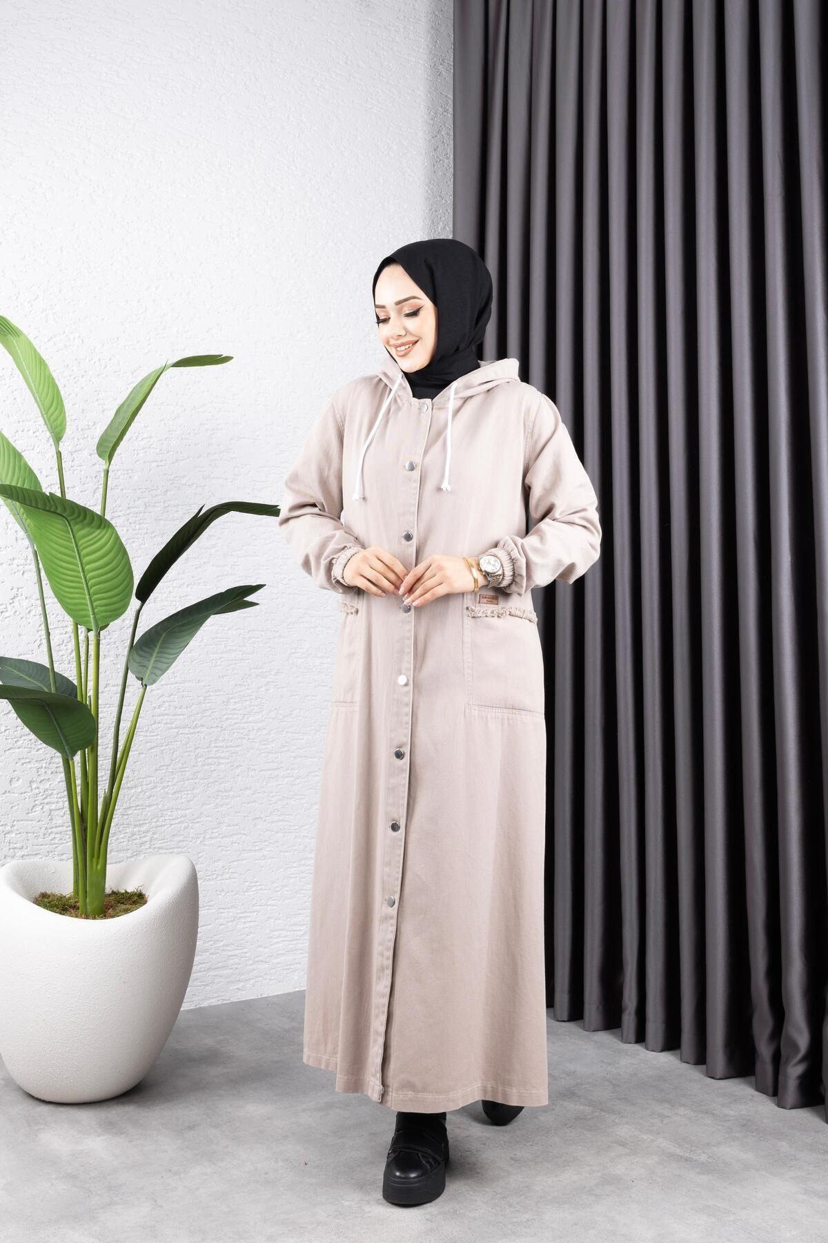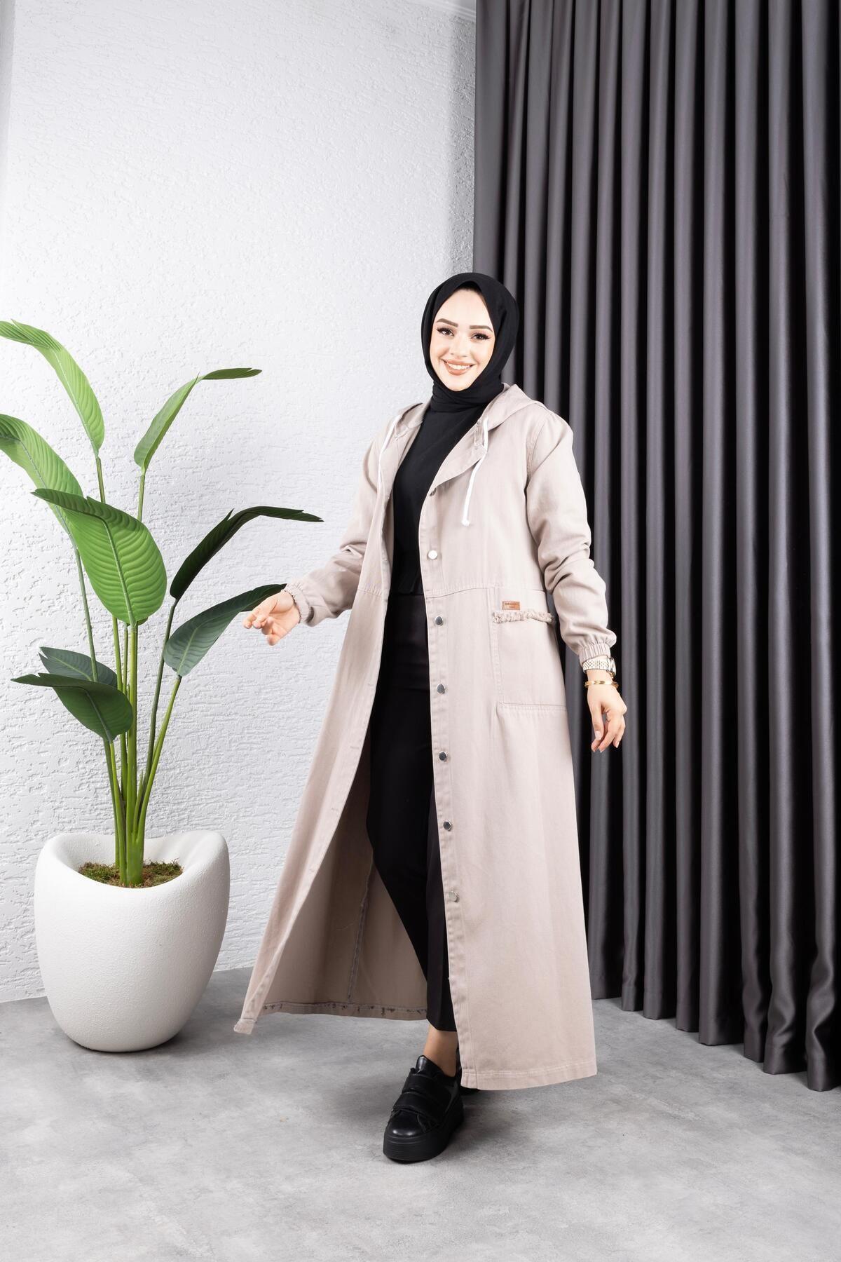 - Tesettür giyim koleksiyonunun şık bir parçası olarak tasarlanmış, her yaş grubuna hitap eden uzun siluetiyle dikkat çeken kot kapüşonlu ceket.