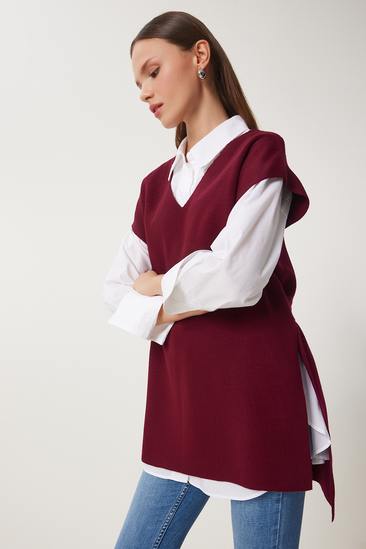 V yaka, kuşaklı, esnek yapılı, yanlardan yırtmaçlı, uzun triko süveter İçerik: %100 Akrilik Ürün boyu: 75 cm 30° makinede yıkanabilir.