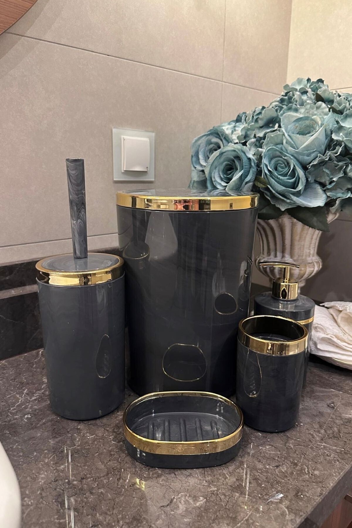 Paket İçeriği: Çöp Kovası WC Fırçalık Sıvı Sabunluk Diş Fırçalık El Sabunluk