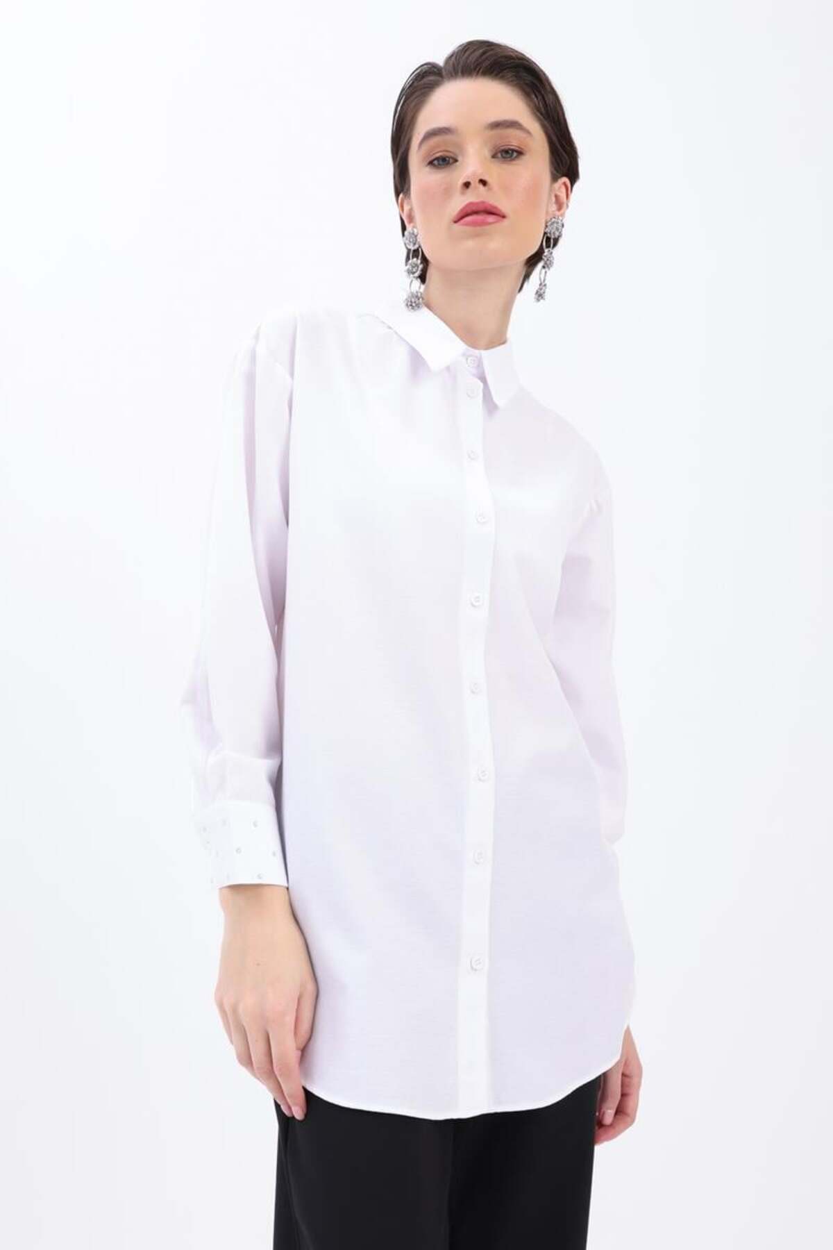 Beyaz-MANŞETİ TAŞLI SİVRİ YAKALI GÖMLEK TUNİK