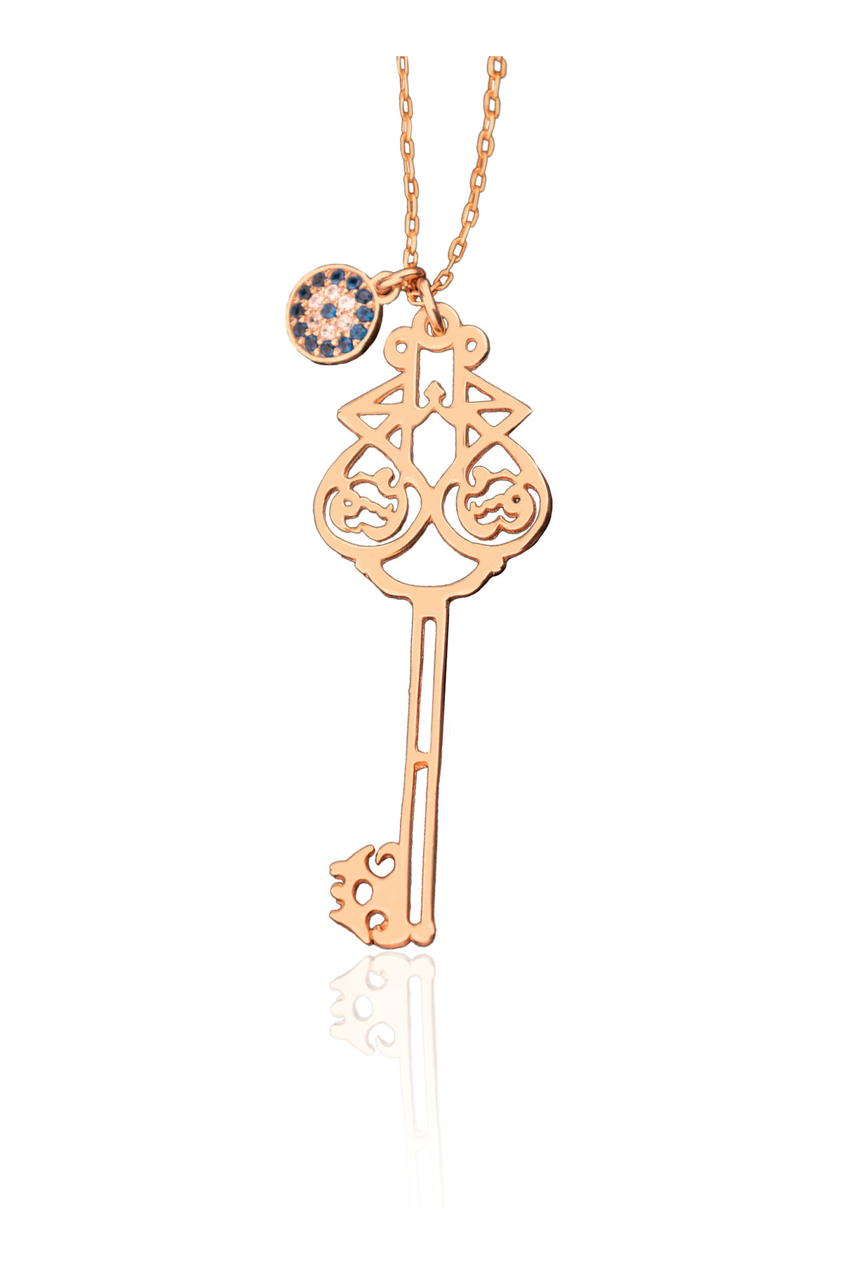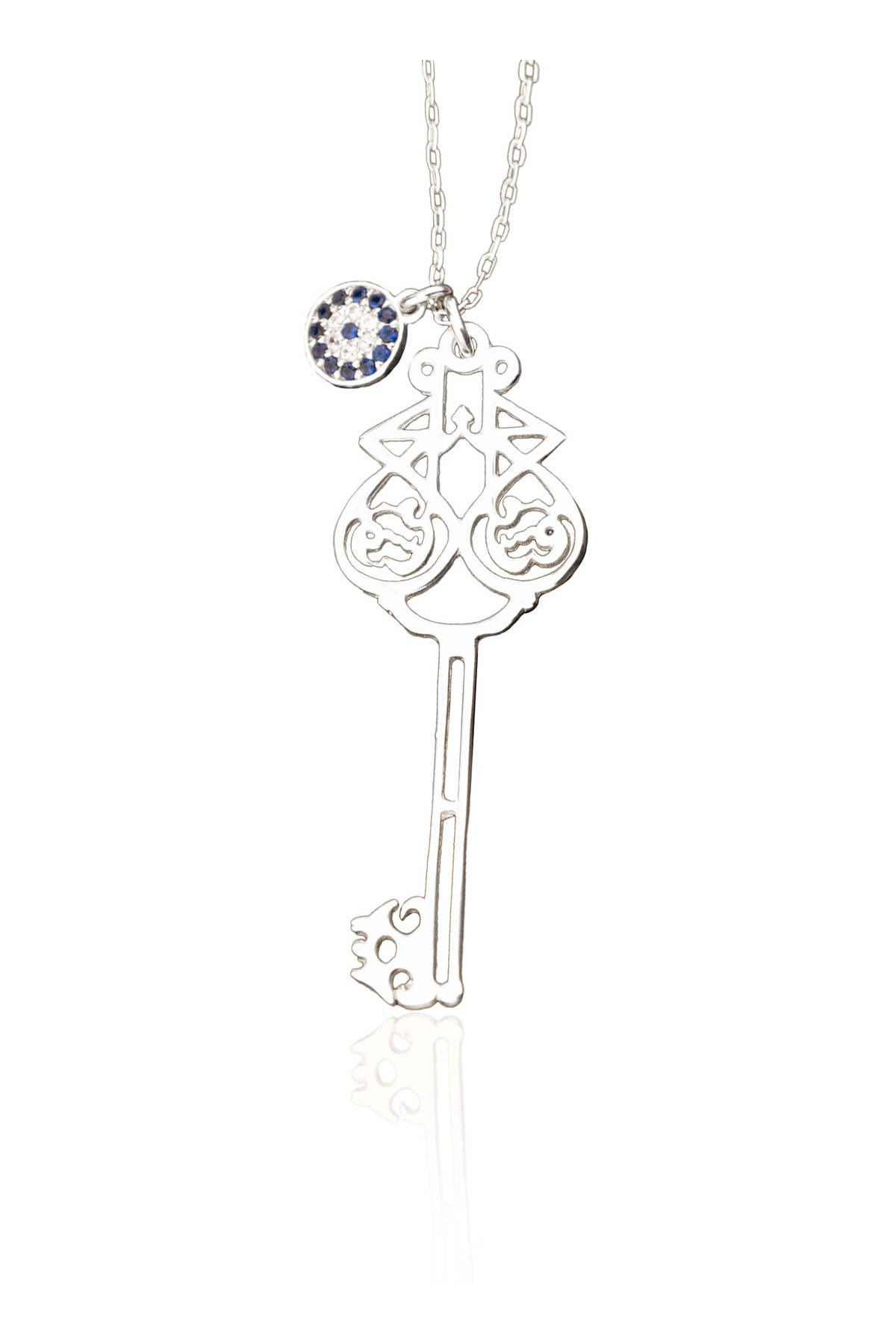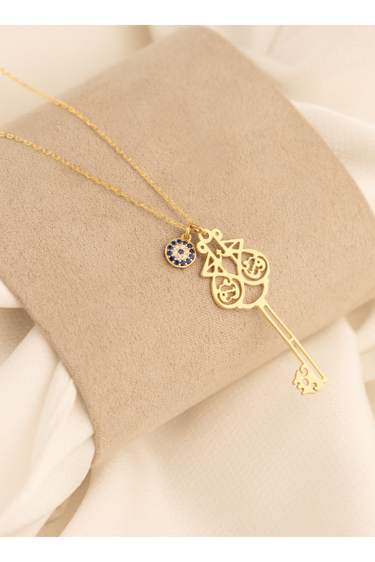 925 AYAR GÜMÜŞ EL FETTAH YAZILI NAZAR BONCUKLU ANAHTAR KOLYE