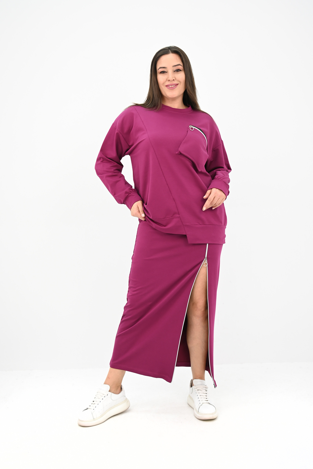 Şık ve konforlu tarzıyla dikkat çeken büyük beden etek takım, 42-50 bedene uyumludur.