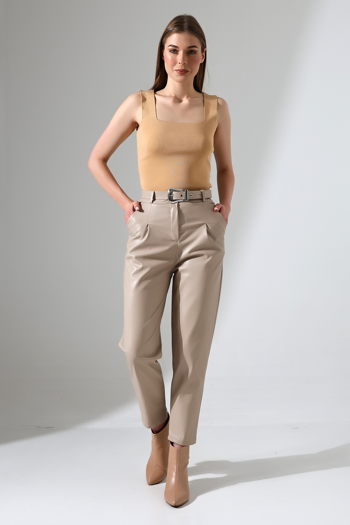 - Klasik ve zamansız tasarımıyla dikkat çeken bu pantolon, yüksek bel kesimi ve suni deri detaylarıyla şıklığınızı tamamlar.