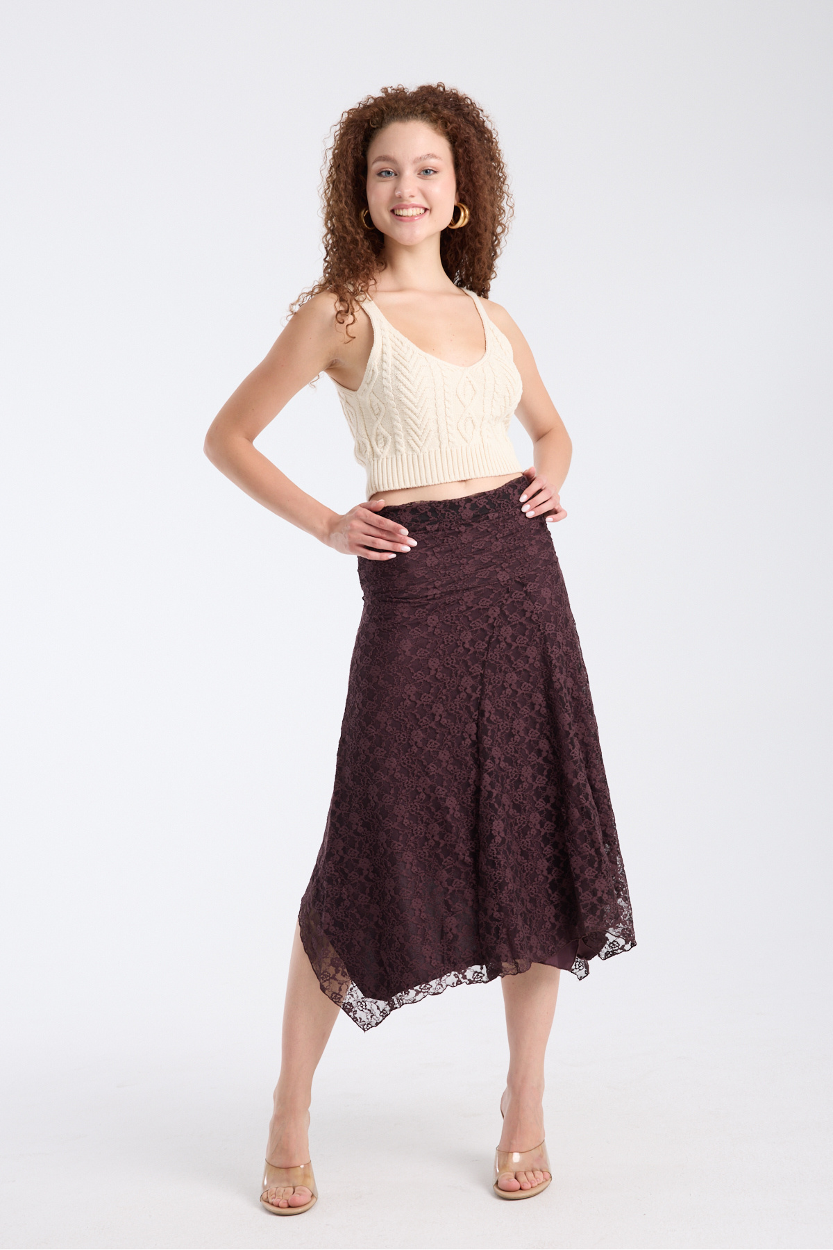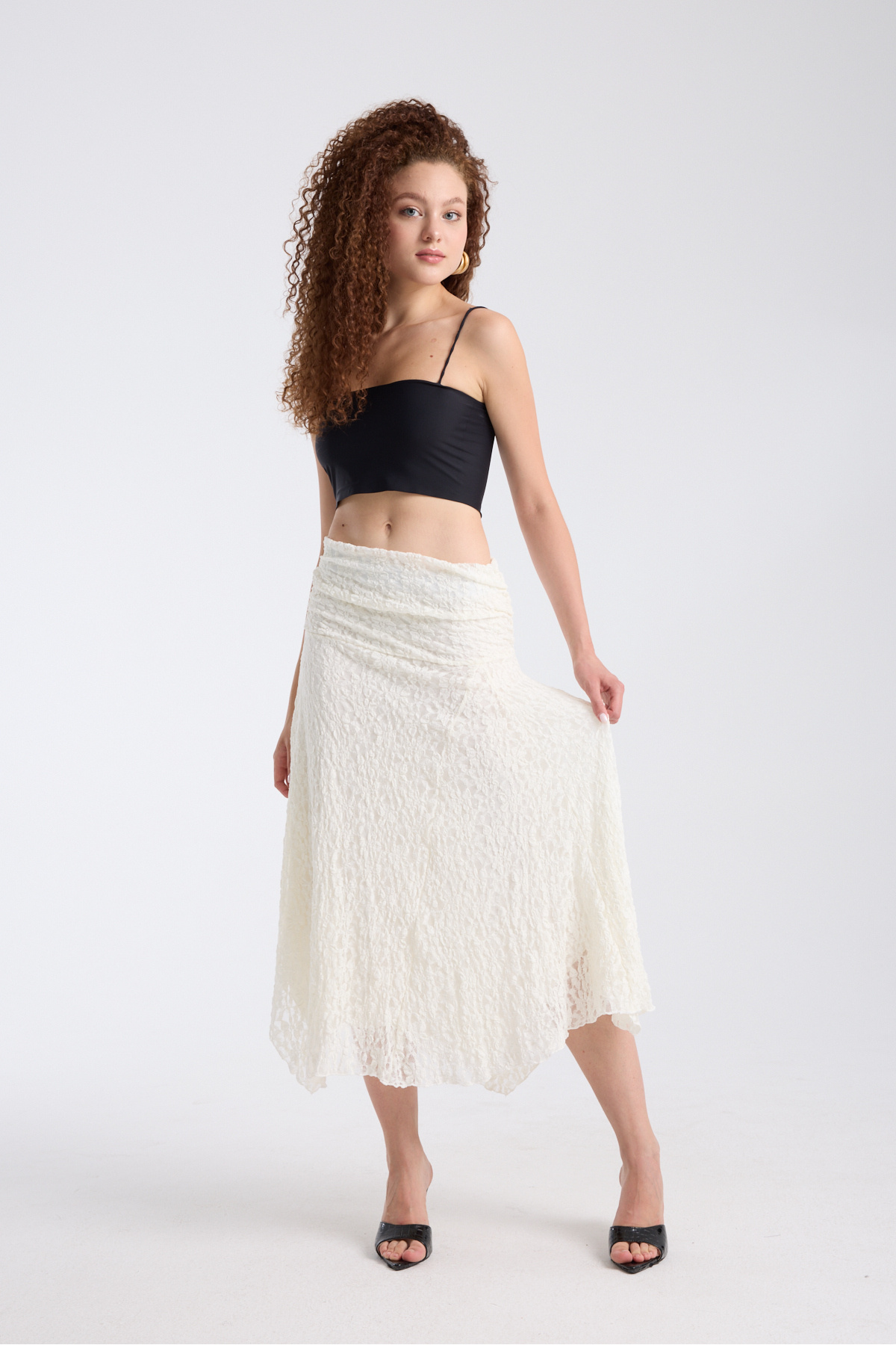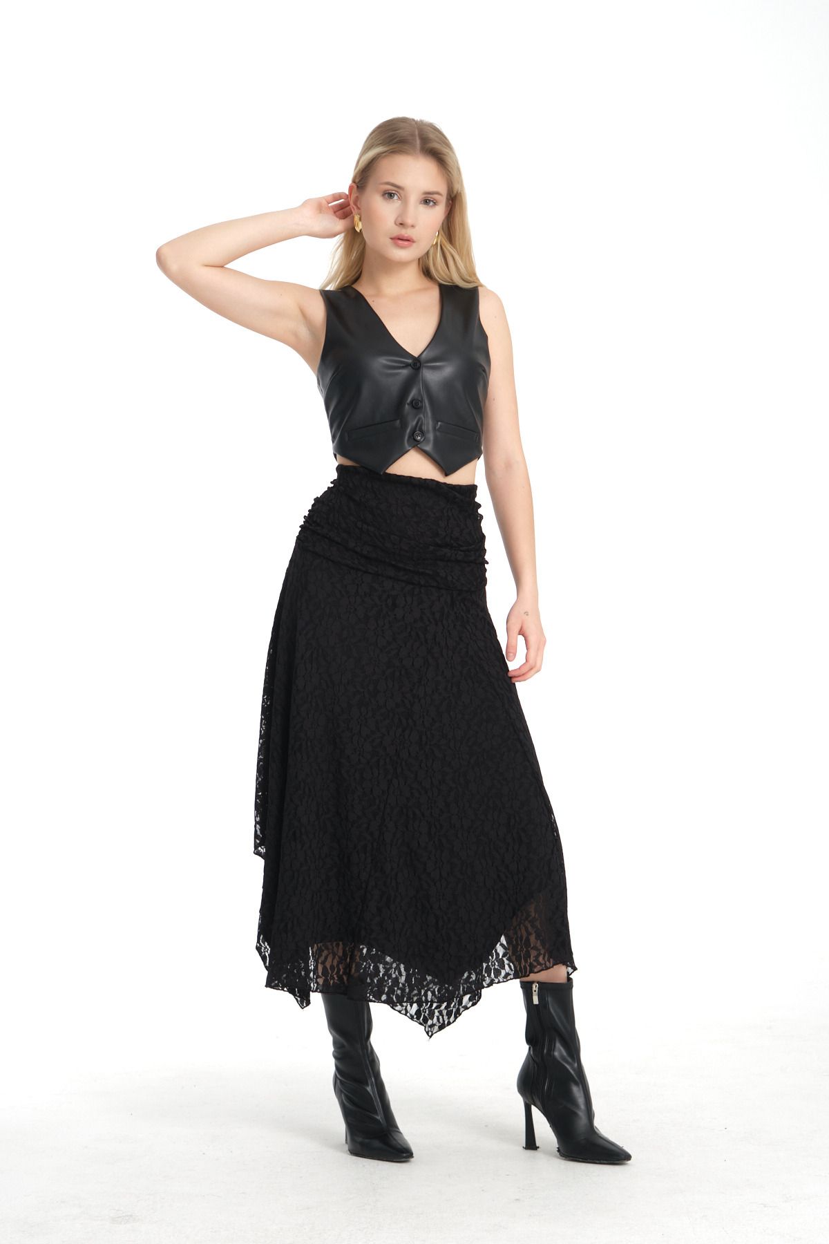 - Zarif dantel dokusuyla dikkat çeken siyah midi etek, her gardıropta yerini alacak bir parça.