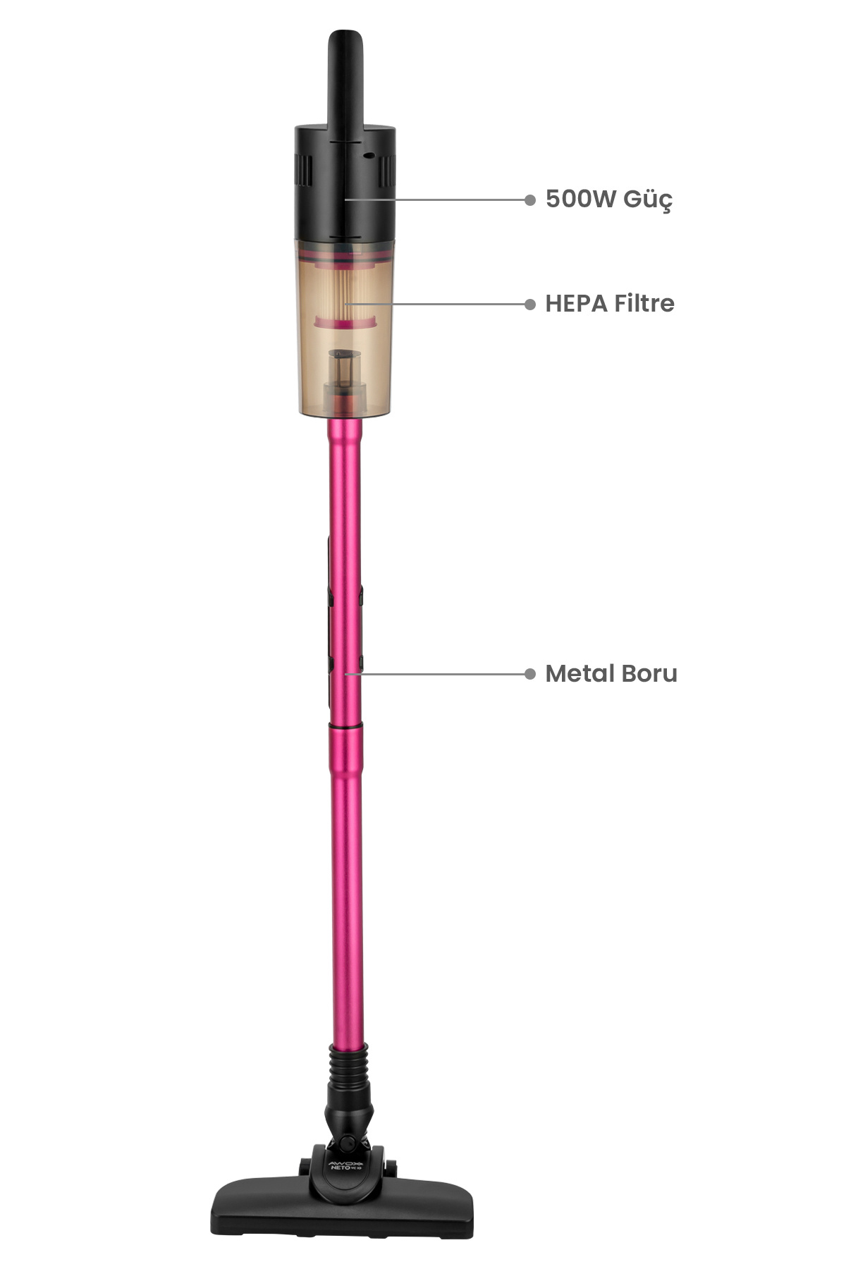 - Dayanıklı metal boru tasarımı, süpürgenizin esnekliğini artırarak her türlü yüzeyde rahatça hareket etmesine olanak tanır.