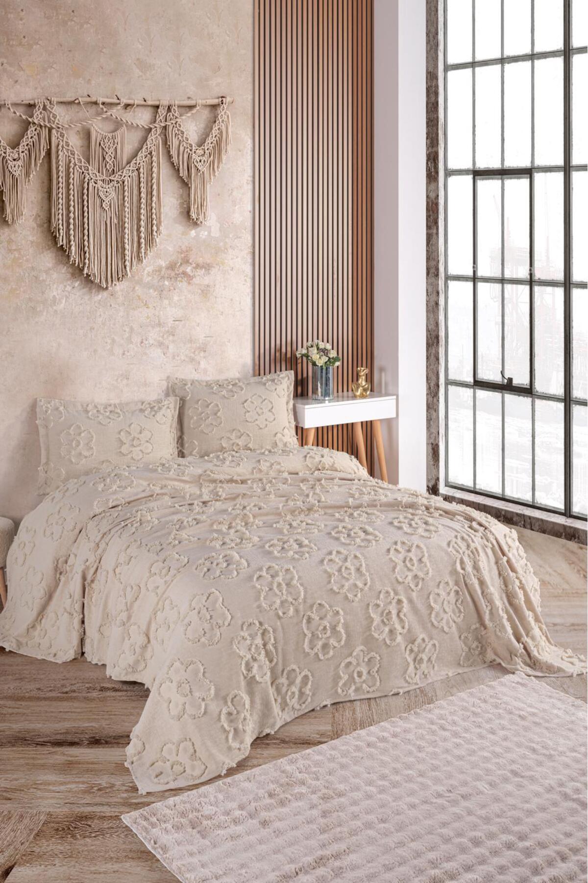 Butik Şönil Battal Boy Yatak Örtüsü Papatya Ekru