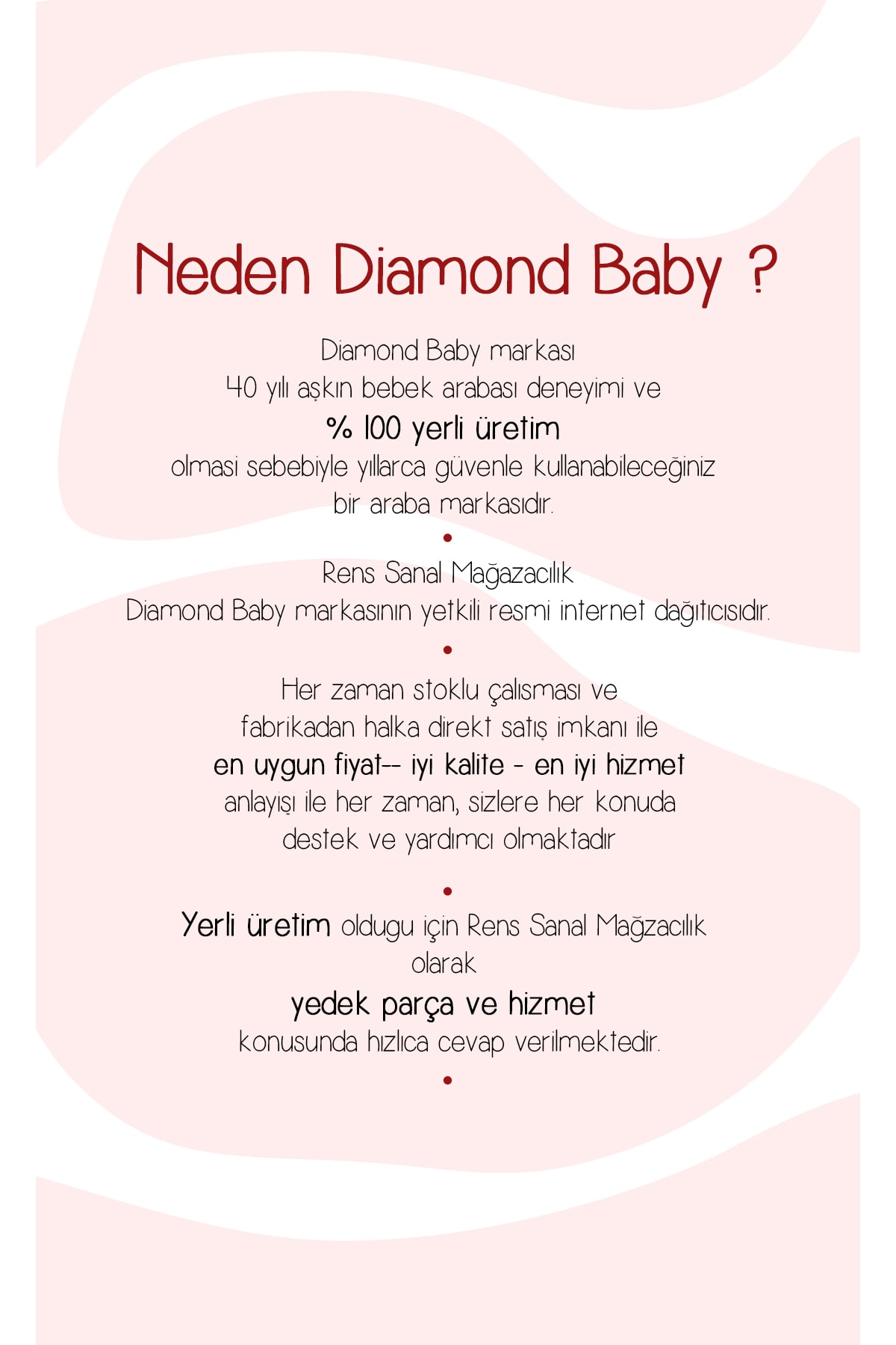 Doğumdan itibaren kullanılabilme Kanserojen madde içermeyen, antibakteriyel özel keten kumaş Çift yönlü bebek arabası olarak kullanım Deri, fermuarlı, yumuşak ve ergonomik sürme kolu Geniş ve konforlu iç hacim Keten kumaş, yumuşak dolgulu, ekstra iç ped Deri kaplamalı ön bar 360 derece dönebilen ve sabitlenebilen, süspansiyonlu, rulmanlı, ön tek tekerler Tentede saklanabilen tente güneşlik siperi Farklı kademelerde tam yatar sırt dayanağı 5 nokta emniyet kemeri Ayarlanabilir omuzluk pedleri Geniş alt sepet Arka tekerlerde fren sistemi Manevra kabiliyeti fazla , büyük arka tekerler Çeşitli kademelerde ayarlanabilir ön ayaklık Tente kısmında malzeme cebi Tente için fermuarlı, keten kumaş, rüzgarlık veya yağmurluk Kanserojen madde içermeyen malzemelerden imal edilmiştir Azor boyar madde, fitalat ve agır metal içermez Kolay, rahat katlanma ve taşıma Katlandıktan sonra kendiliğinden ayakta durabilme özelliği 0- 36 ay veya 20 kg’a kadar kullanım imkanı