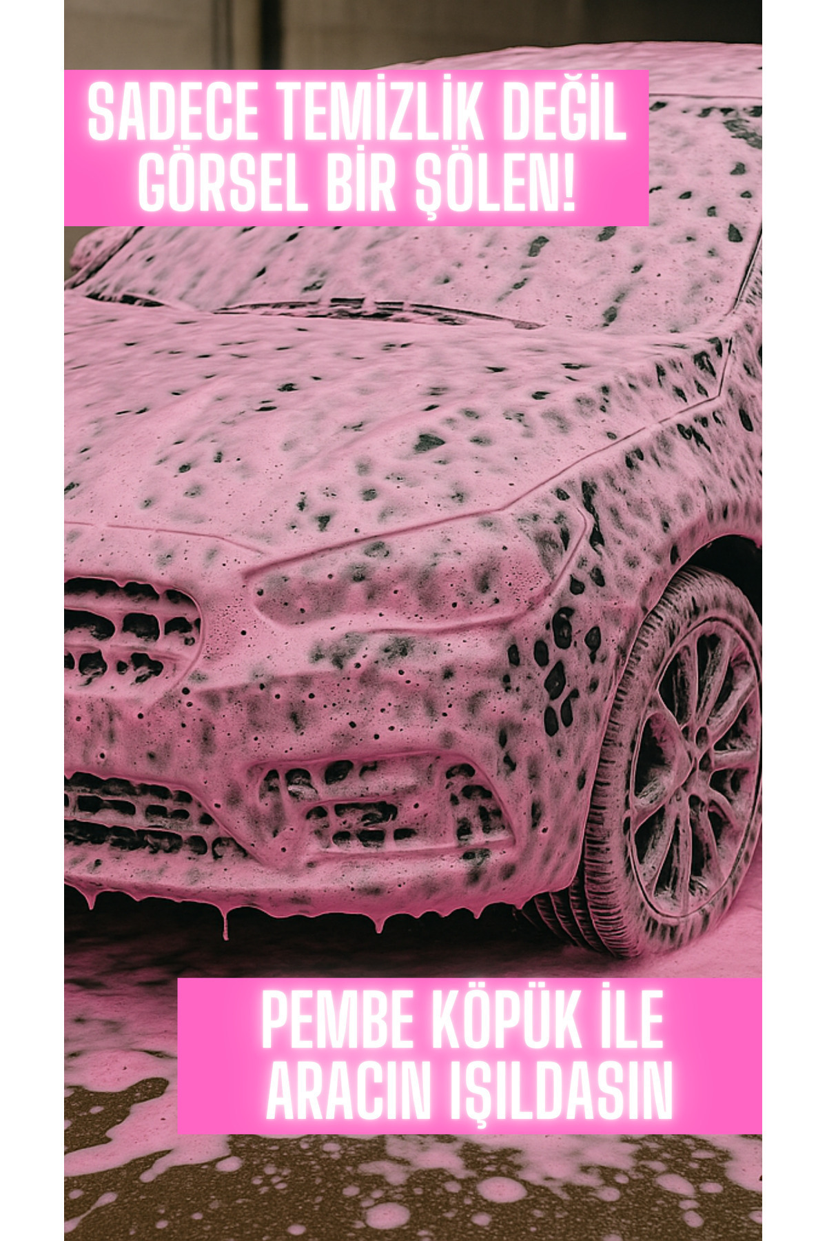 - Pembe renkli cilalı oto yıkama köpüğü, aracınızın parlaklığını artırırken temizlik yapar.