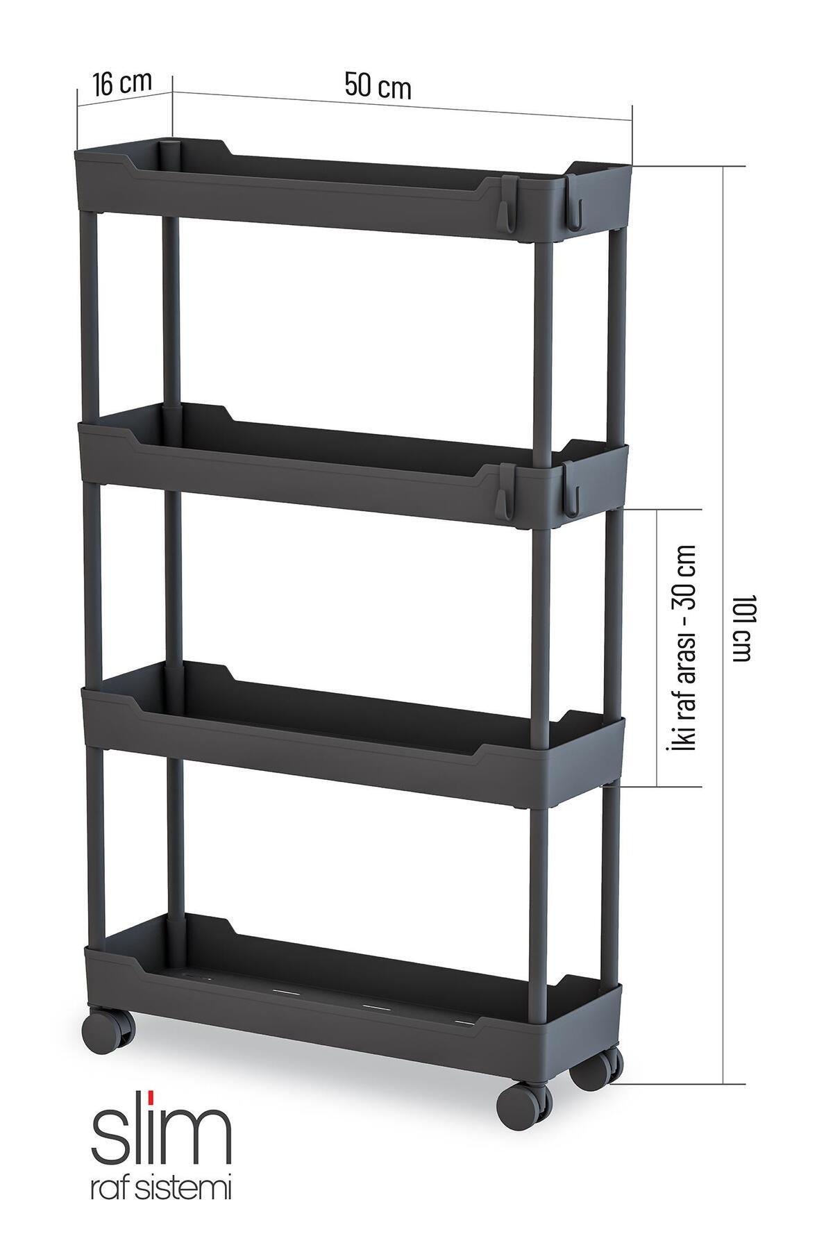 Ürün Ölçüleri: Tekerlekli Kullanım : En: 16 Cm Derinlik: 50 Cm Yükseklik 101 Cm Raf arası: 30 cm Ayaklı Kullanım : Yükseklik 98,5 Cm Mutfak ve banyo alanlarınızı düzenlemek hiç bu kadar kolay olmamıştı.