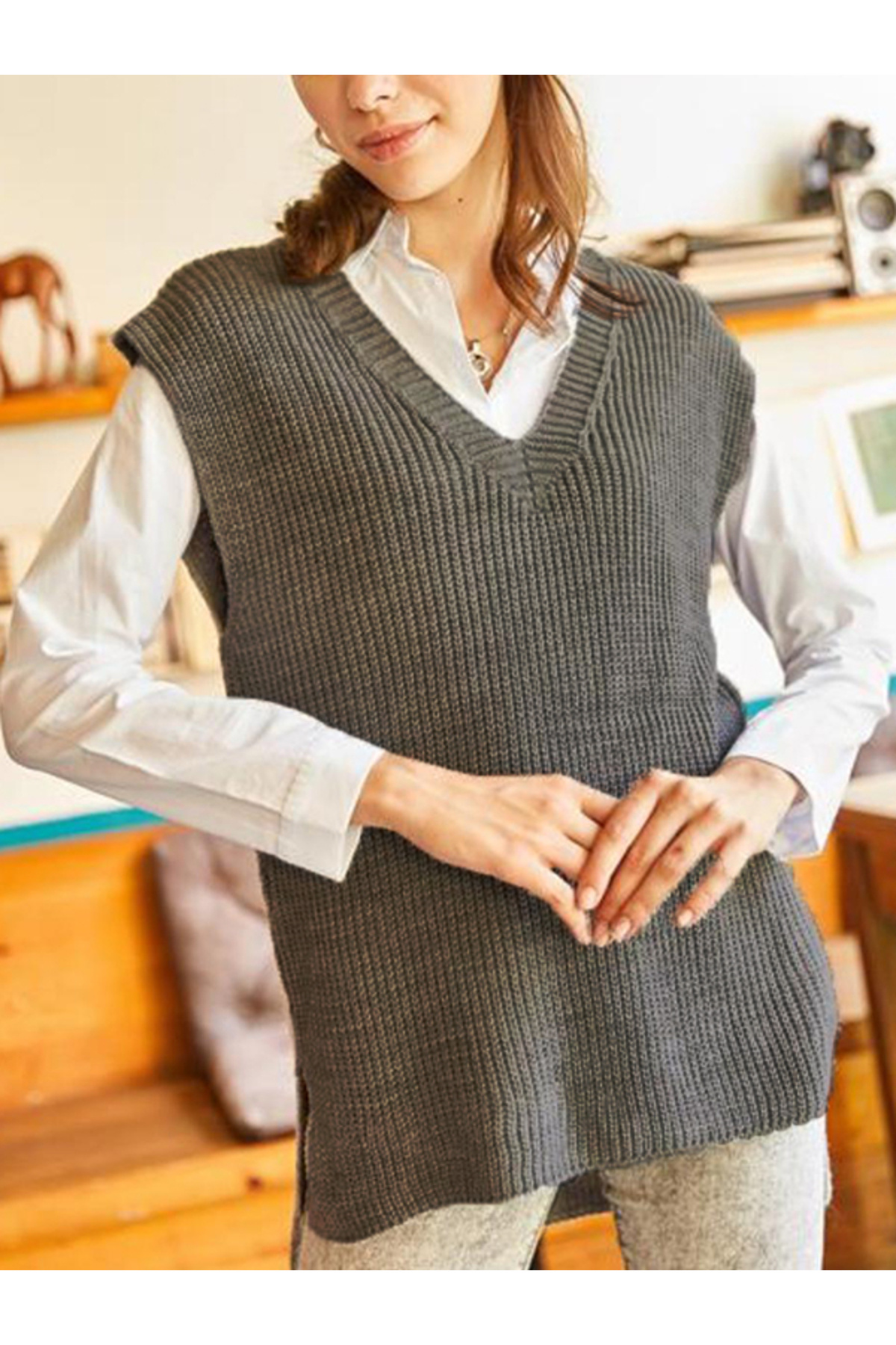 - 75 cm uzunluğundaki bu triko süveter, rahat kesimi ve kolsuz tasarımı ile günlük kullanım için idealdir.