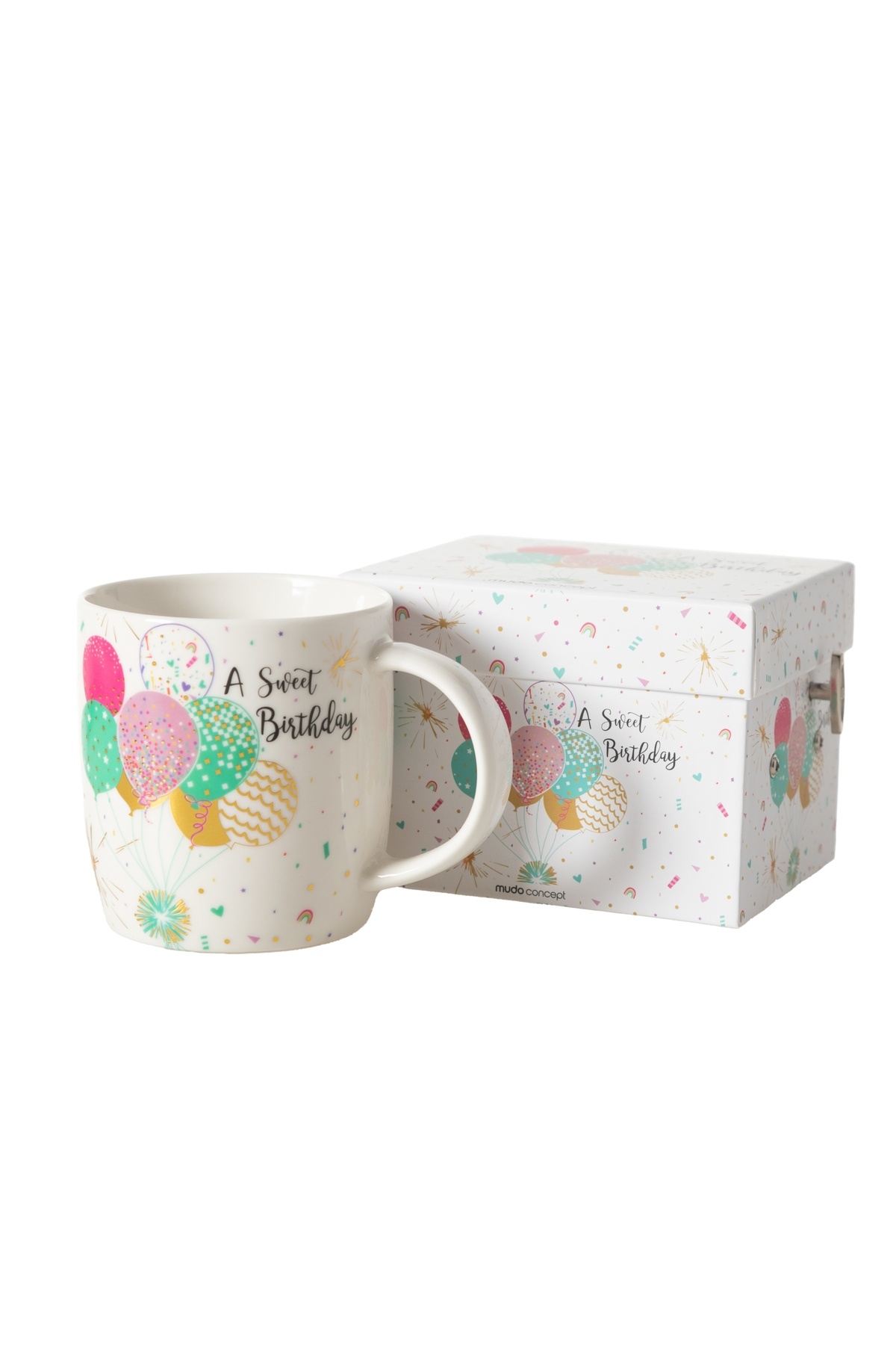 Parti temalı desenlerle süslenmiş renkli ve neşeli bir tasarıma sahip porselen kupa