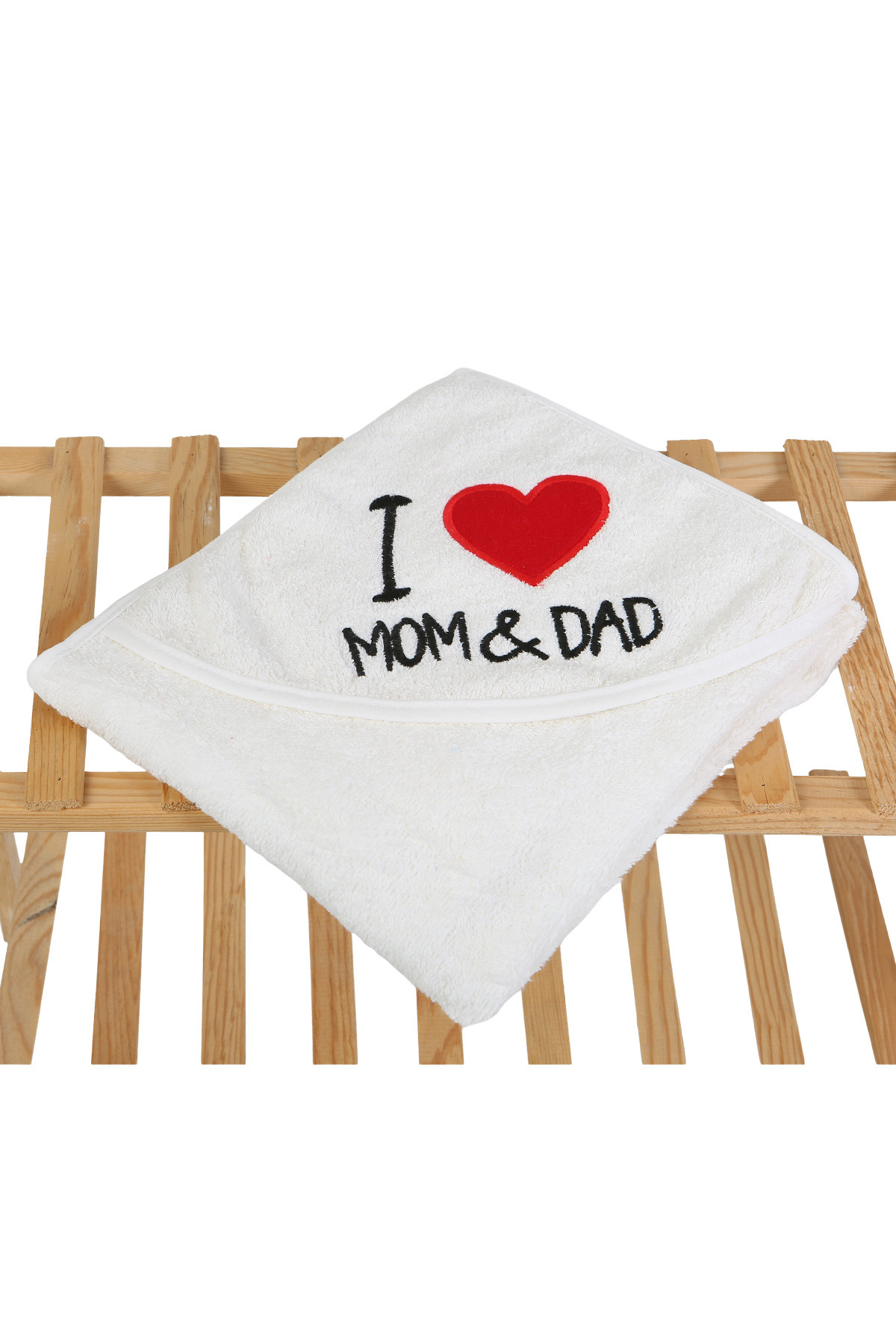 %100 Pamuk Yenidoğan Bebek Kundak Nakışlı Banyo Havlusu Mom Dad Krem