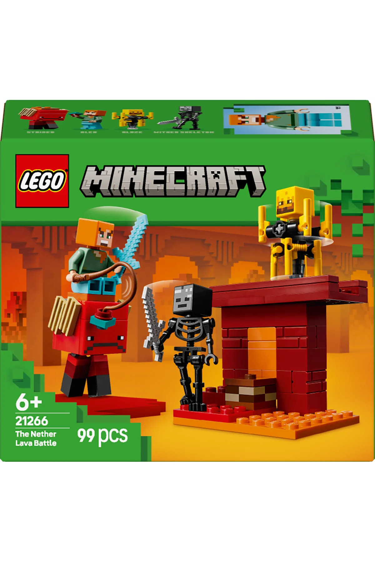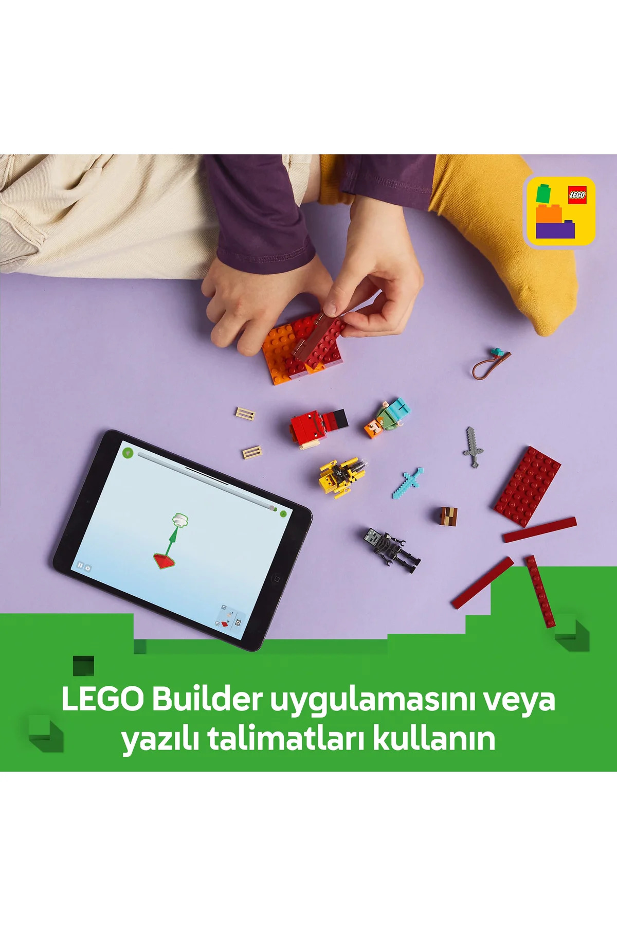 LEGO Minecraft Nether Lav Savaşı (21266) ile popüler video oyununu yap ve oyna. Bu çok yönlü Minecraft aktivite seti, 6 yaş ve üzeri çocuklar için eğlenceli özellikler ve sınırsız aksiyon sunan mükemmel bir hediye fikridir. Minecraft sever kız ve erkek çocuklar, kızıl ormandaki Nether kalesi köprüsünün bir bölümündeki antik kalıntıları temizleme görevinde Minecraft kahramanı Alex'e katılır. Kalıntı kaldırıldığında, lav parçaları otomatik olarak aşağı düşer ve taş kılıç kullanan wither iskelet ve çubuk döndüren blaze figürleri, Alex'in kaçışını engeller. Çocuklar, moblarla savaşmak için elmas kılıç kullanır ve ardından hareketli bacakları ve eyeri olan başka bir Minecraft figürü olan yolgezere binerek kaçar. Yolgezeri kullanmak için çarpık mantar kullanabilirler. Ayrıca, ekstra dijital eğlence için LEGO Builder uygulamasını kullanarak modelleri 3 boyutlu olarak yakınlaştırabilir, döndürebilir ve ilerlemelerini gözlemlemek için kaydedebilirler.