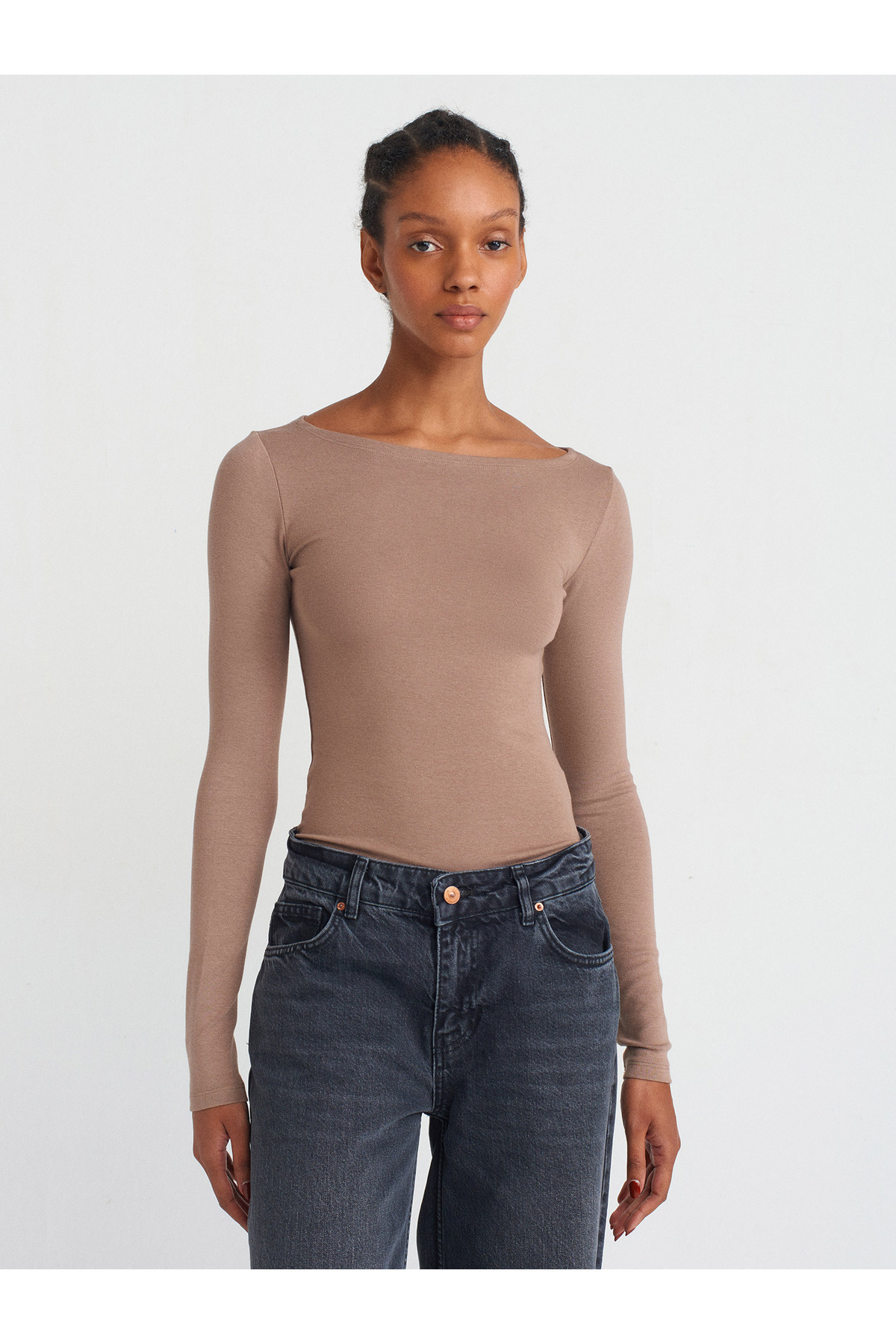31332 Kayık Yaka Uzun Kollu Top-Koyu Kahve
