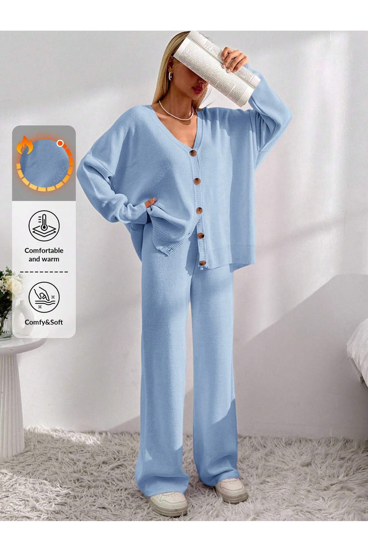 - İki parçadan oluşan set halinde sunulan hırka ve pantolon kombinasyonu.
