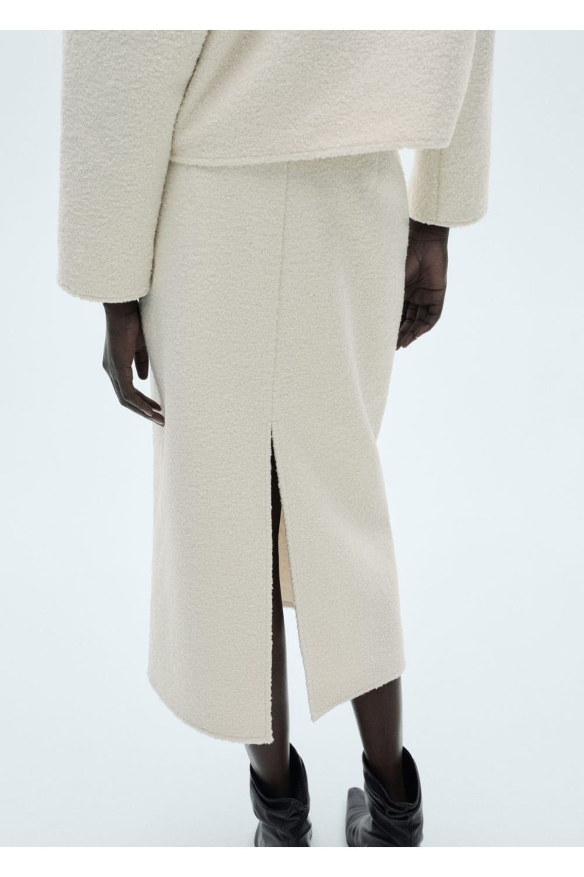 Buklet kumaş, Midi tasarım, Düz kesim, Orta bel, Elastik bant, Yandan kapama, Arka kısımda yırtmaç detayı, Total look.