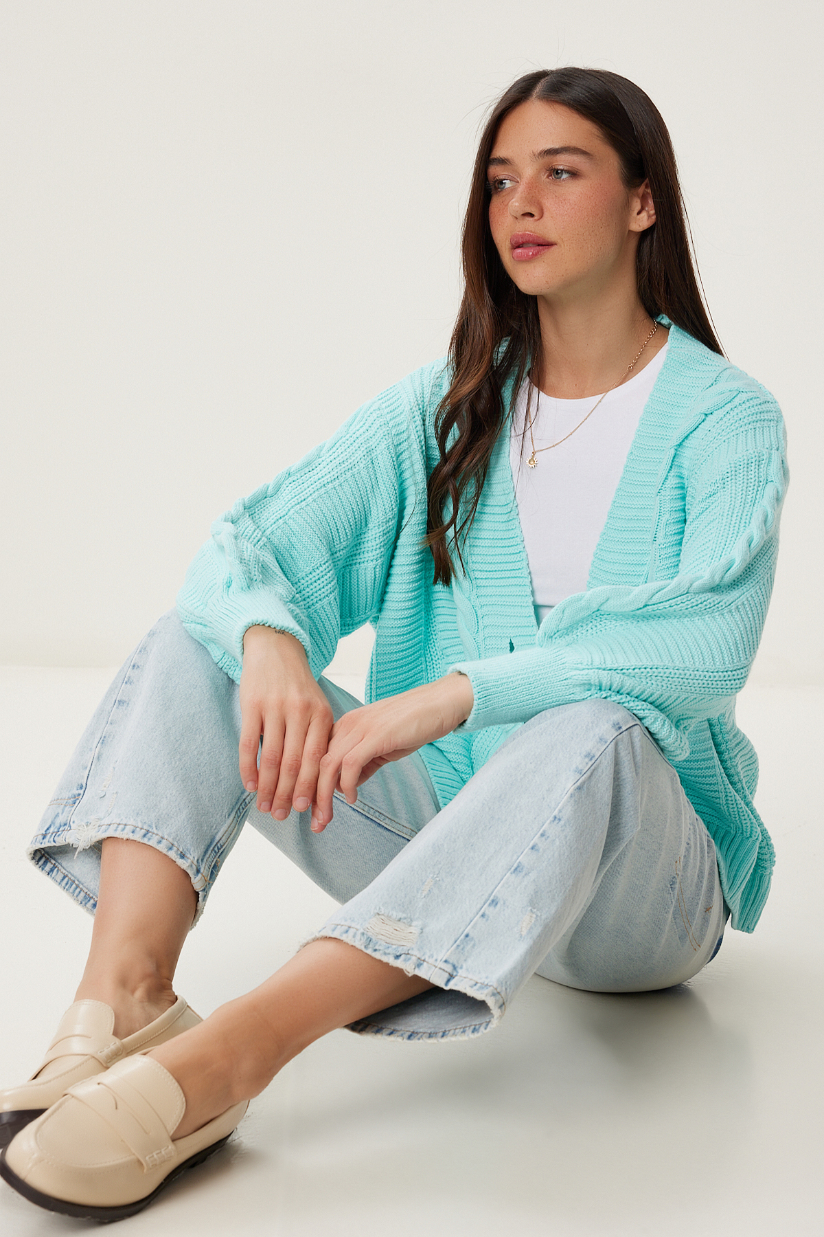 • V yaka, örgülü, balon kollu, esnek yapılı, düğme kapamalı, salaş triko hırka