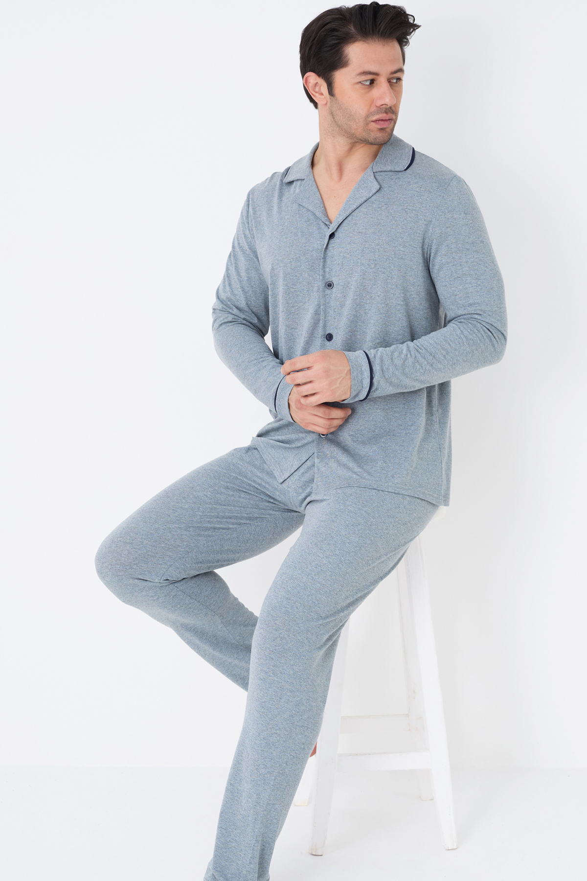 Siyah Erkek Pamuklu Gömlek Yaka Düğmeli Biyeli Pijama Takım