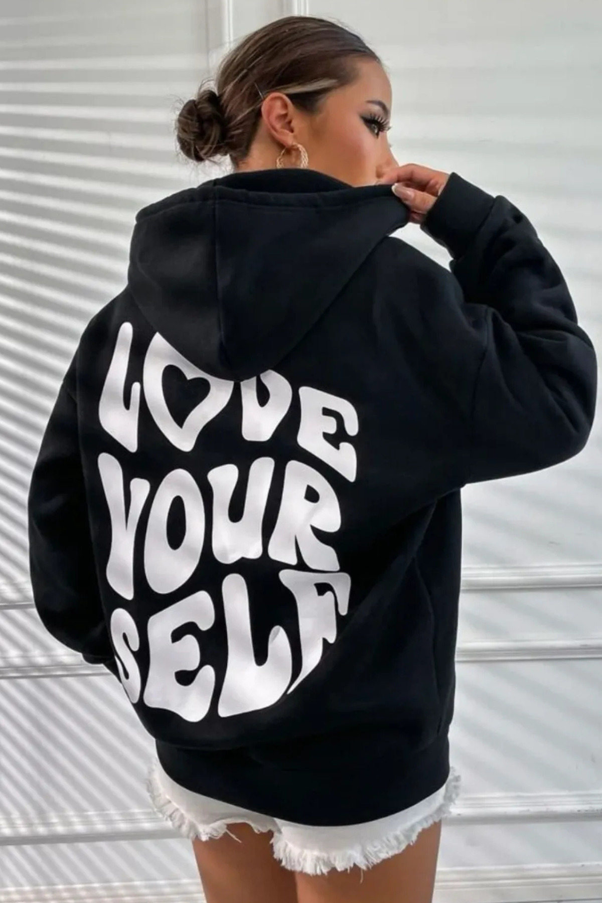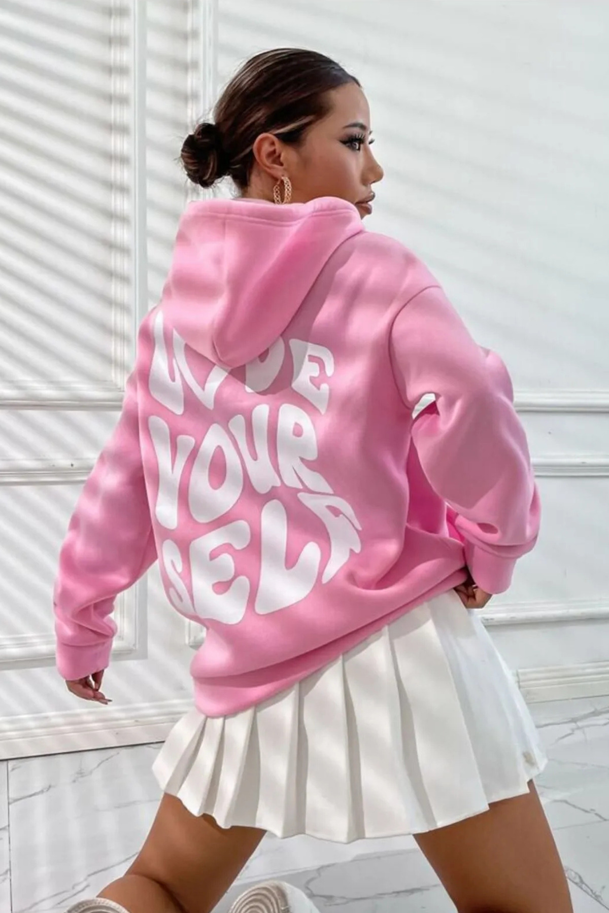 Kapüşonlu Sweatshirt Oversize Love Your Self Baskılı 3 Iplik Şardonlu %100 Pamuk