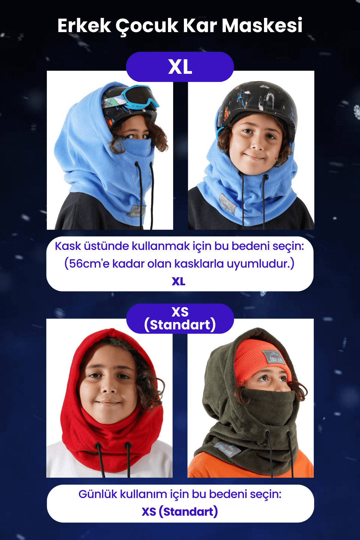 kayak veya snowboard yapıyorsanız 3xl bedenli ürünümüzü kaskınızın üstünde kullanabilirsiniz.