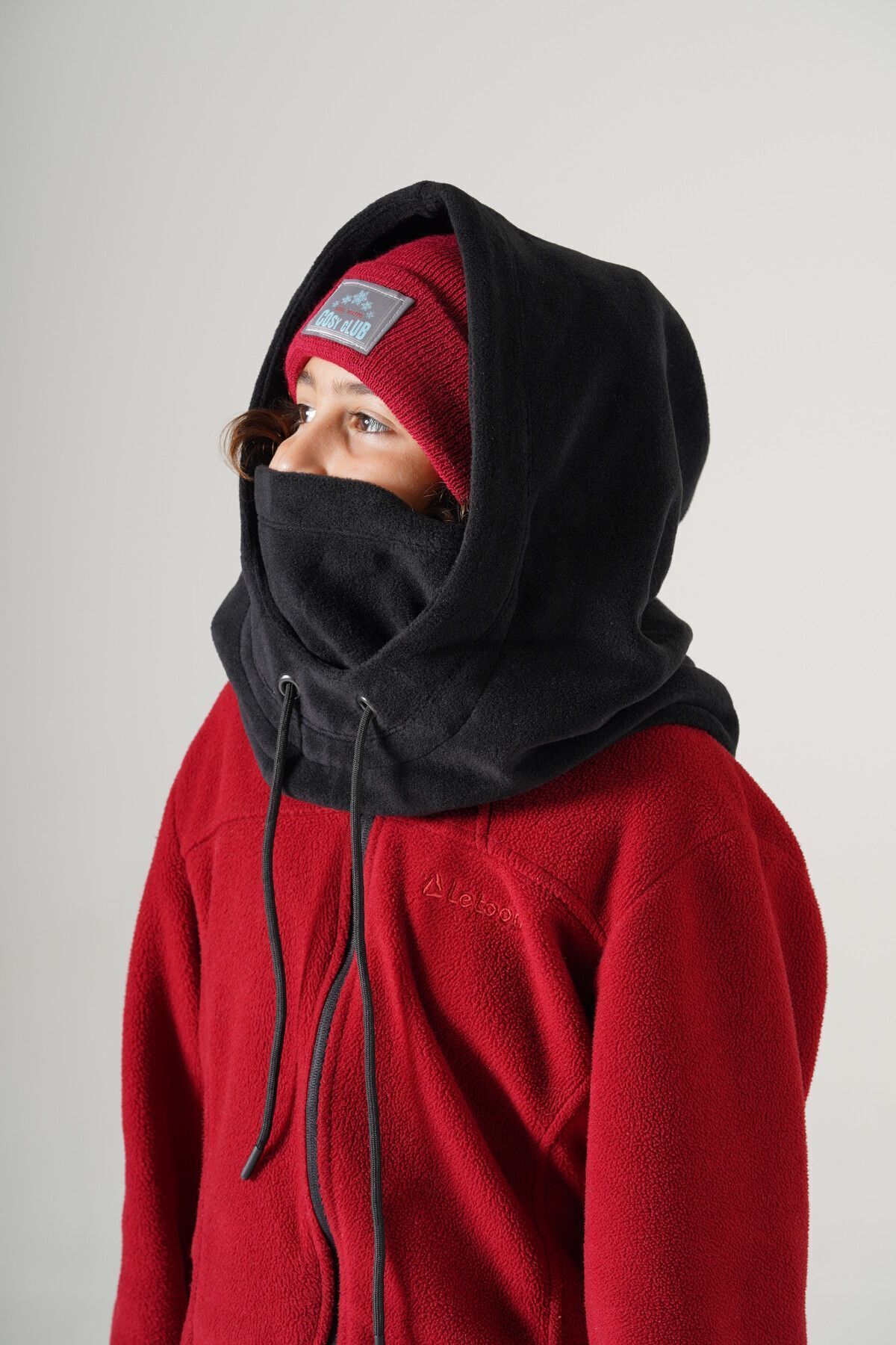 şapka atkı bir arada çok fonksiyonlu polar kar maskesi ile yanaklar ve ense rüzgar ve soğuktan tamamen korunur, sert hava koşullarında maskeyi yukarı kaldırarak ağız ve burun kapatılır.