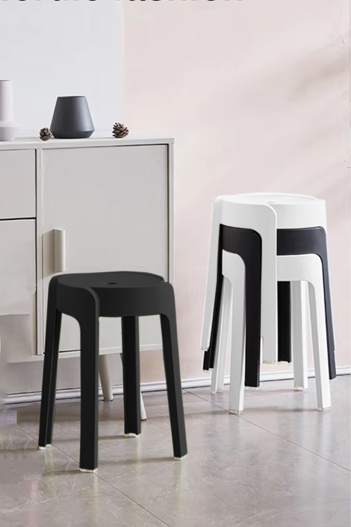 Kaymaz Ayaklı Dekoratif Iç Içe Geçebilen Plastik Tabure Mutfak Bahçe Taburesi 4 Adet Antrasit Beyaz
