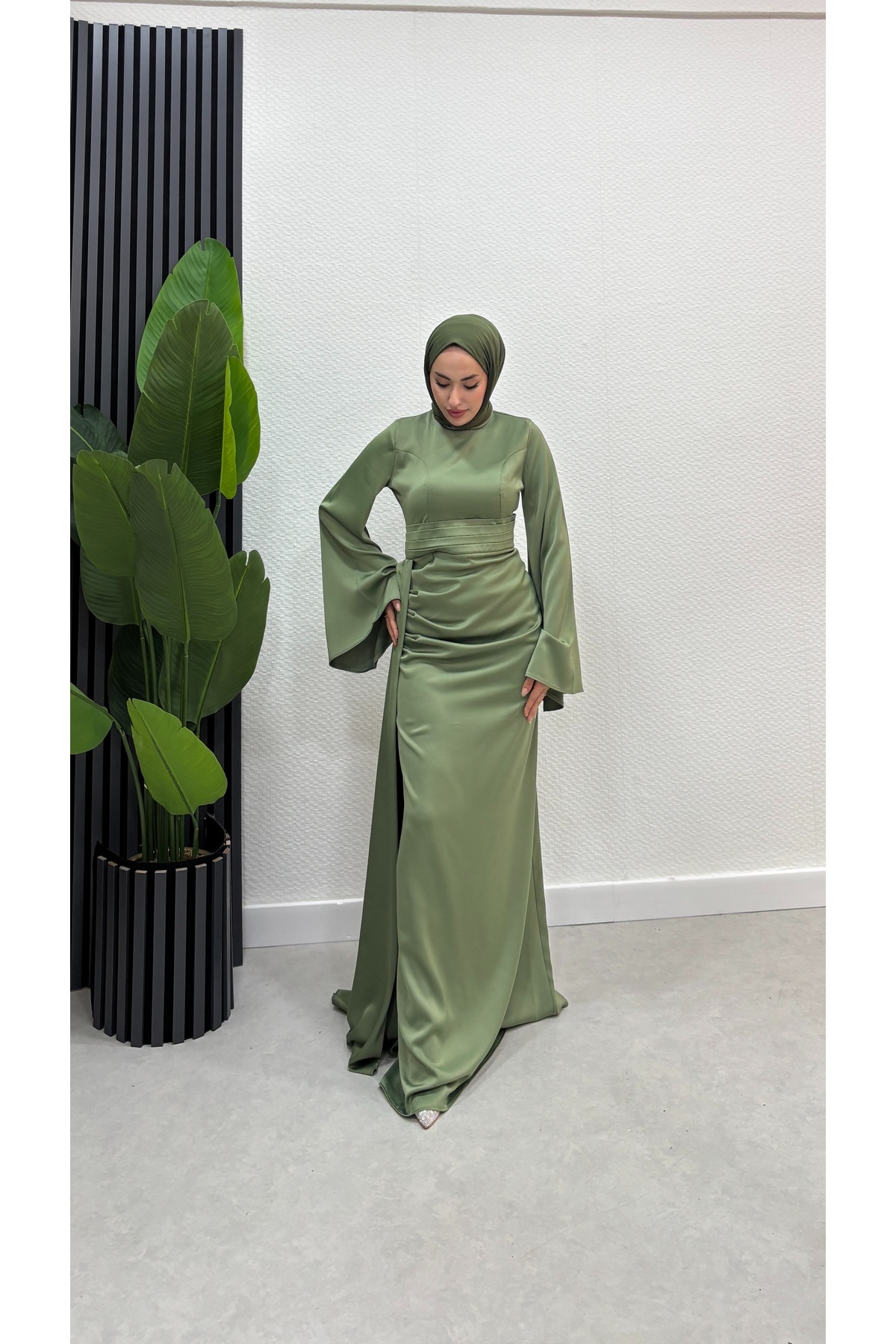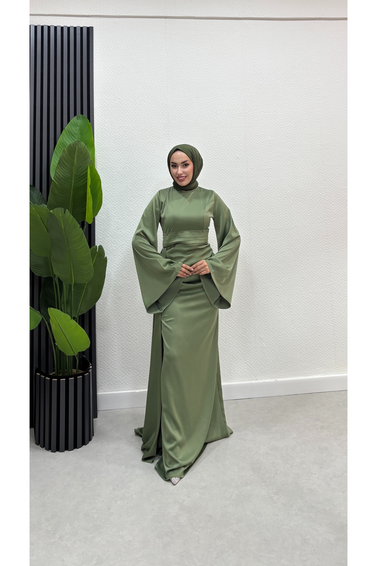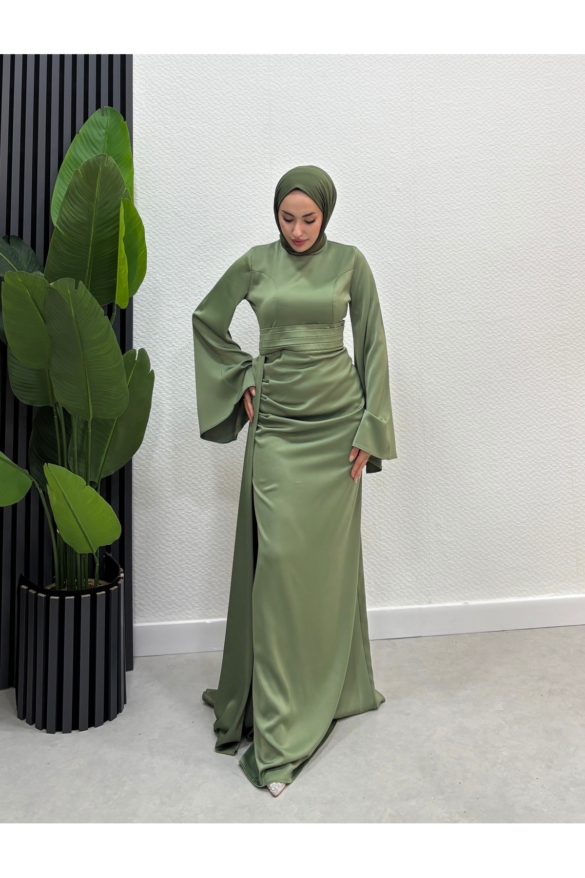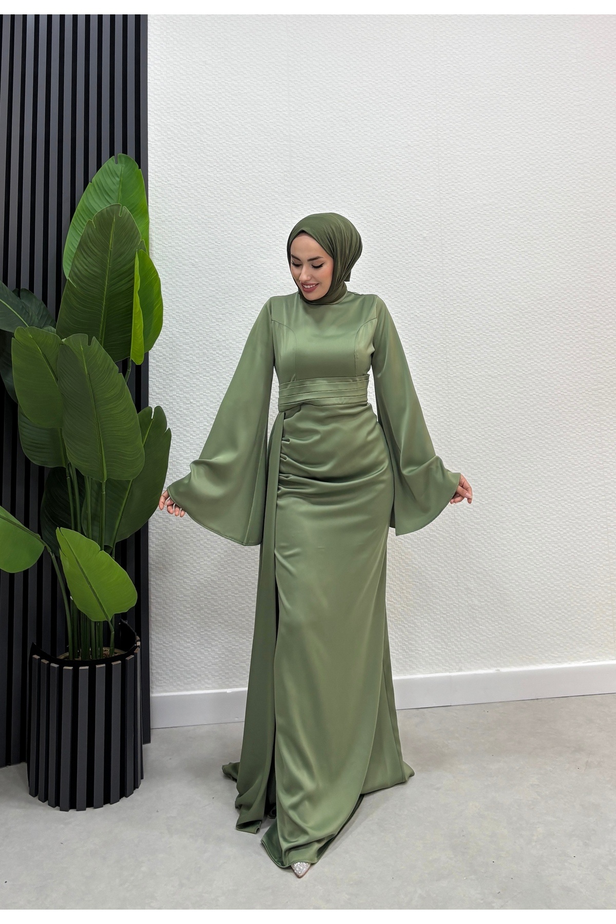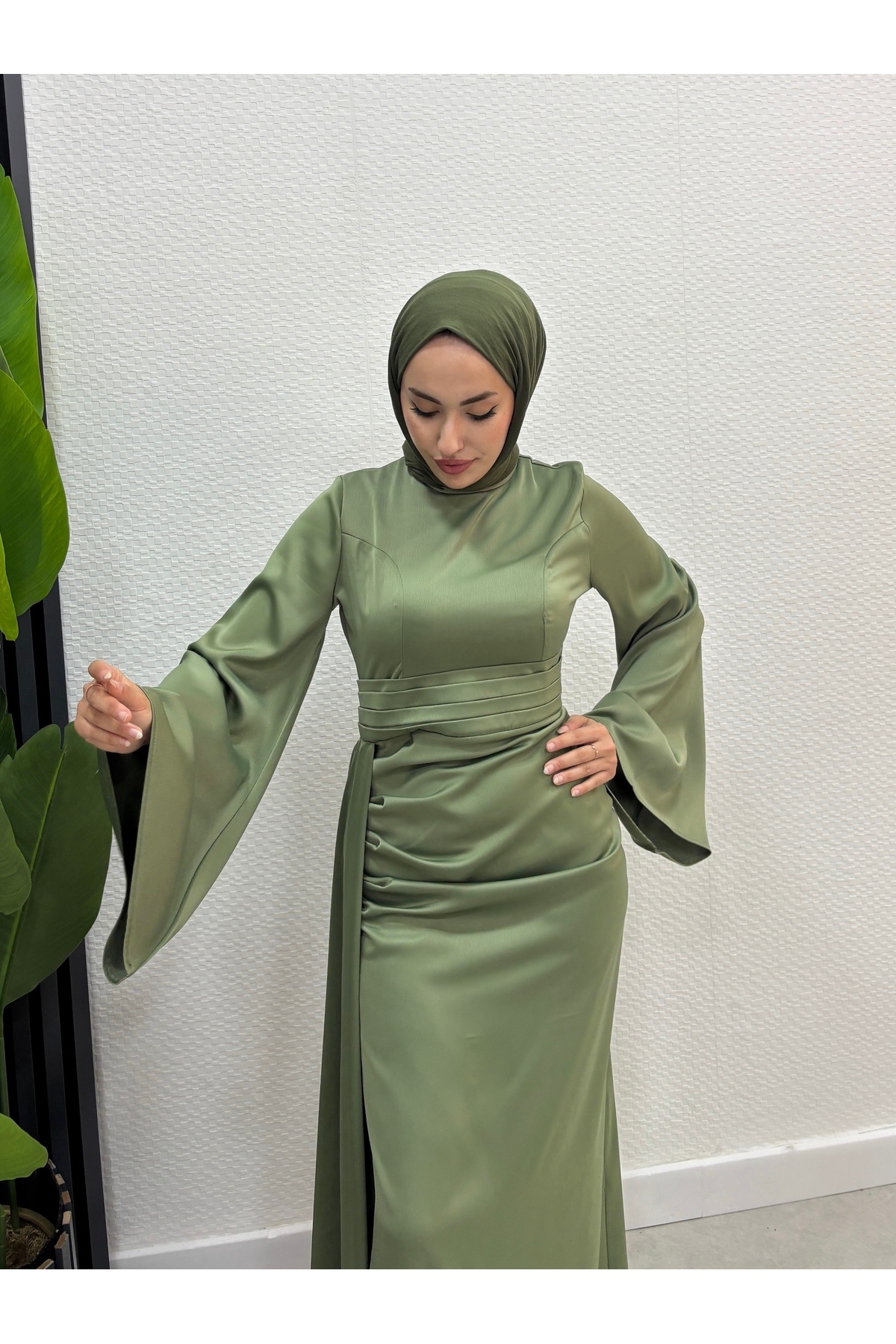 İspanyol Kol Kuyruklu Saten Tesettür Abiye