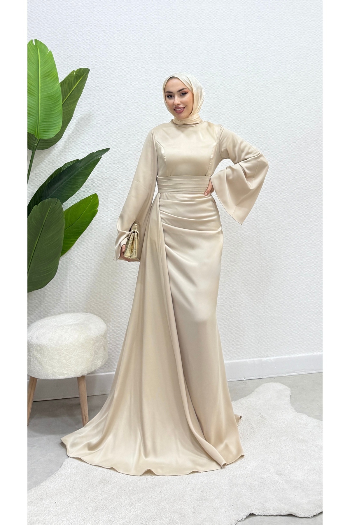İspanyol Kol Kuyruklu Saten Tesettür Abiye