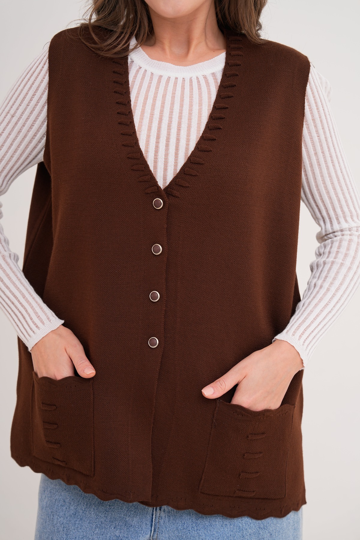 - Bisiklet yakası modern ve zamansız bir tarz sunarken dokuma detaylarıyla zenginleştirilmiştir.