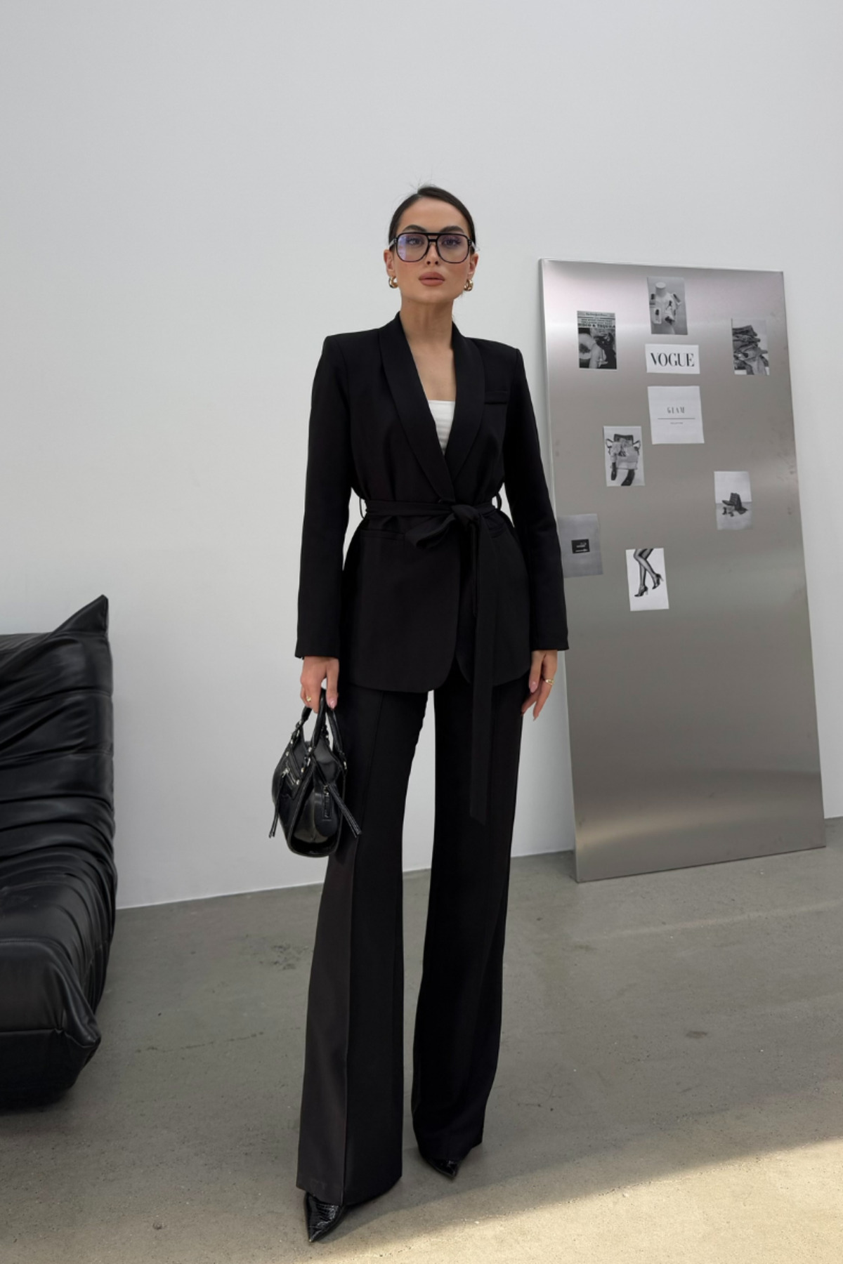 Pantolonun geniş paça kesimi modern bir dokunuş sağlarken, ceketin kuşak detayı belinizi vurgular.