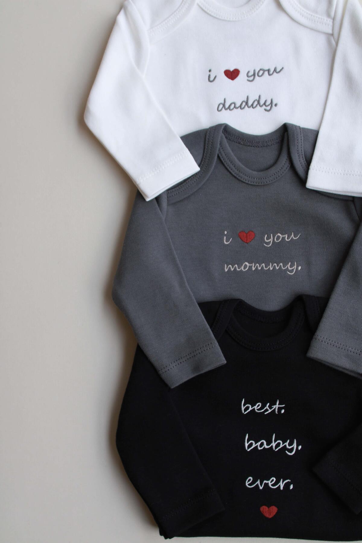 Yazılı Nakışlı Body Set Regular kalıp sayesinde bebeğinizin hareket özgürlüğünü kısıtlamadan rahat bir oturuş sunar