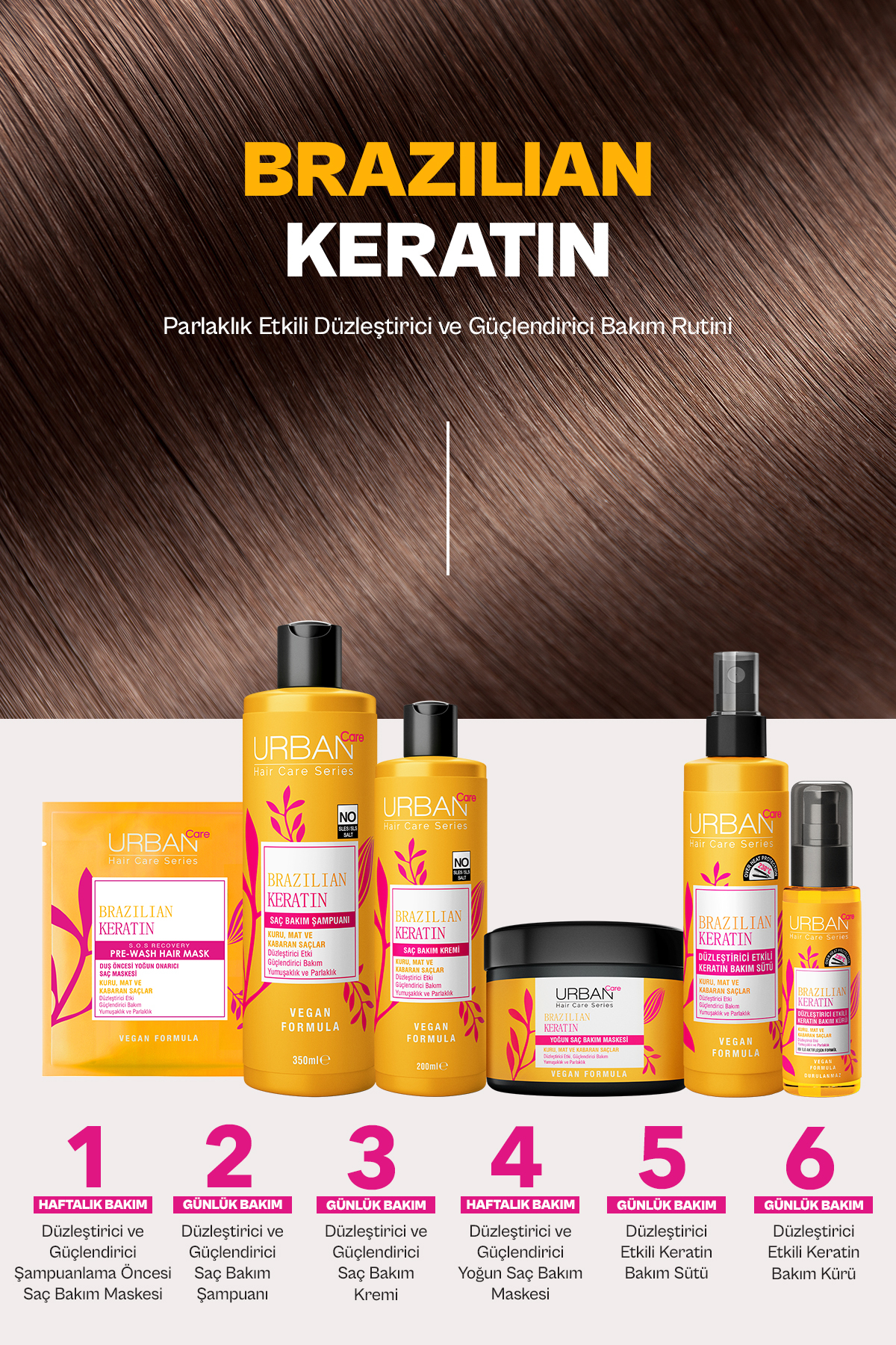 "URBAN Care Brazilian Keratin Düzleştirici Etkili Keratin Saç Bakım Kürü, özel olarak geliştirilmiş formülü besleyici ve nemlendirici bakım sağlarken anında daha parlak, düz ve kolay taranan pürüzsüz saçlara sahip olmanızı sağlar.İçeriğinde bulunan Hidrolize Keratin, saç telinin yapısal bütünlüğünü desteklemeye ve saç telindeki hasarları onarmaya yardımcı olur. Saçın kırılganlığını azaltmayı destekler. Saç tellerini sararak koruyucu bir tabaka oluşturur ve saç telini düzleştirerek mükemmel pürüzsüzlük sağlar. Elektriklenmeyi engeller. % 100 Doğal Marula yağı, içerdiği vitaminler sayesinde saç tellerini besler ve güçlendirici bakım sunar. Vitamin E sayesinde saçın doğal nem dengesini korurken saç dokusunu daha yumuşak ve pürüzsüz olmasını destekler, doğal parlaklığının ortaya çıkmasına yardımcı olur.