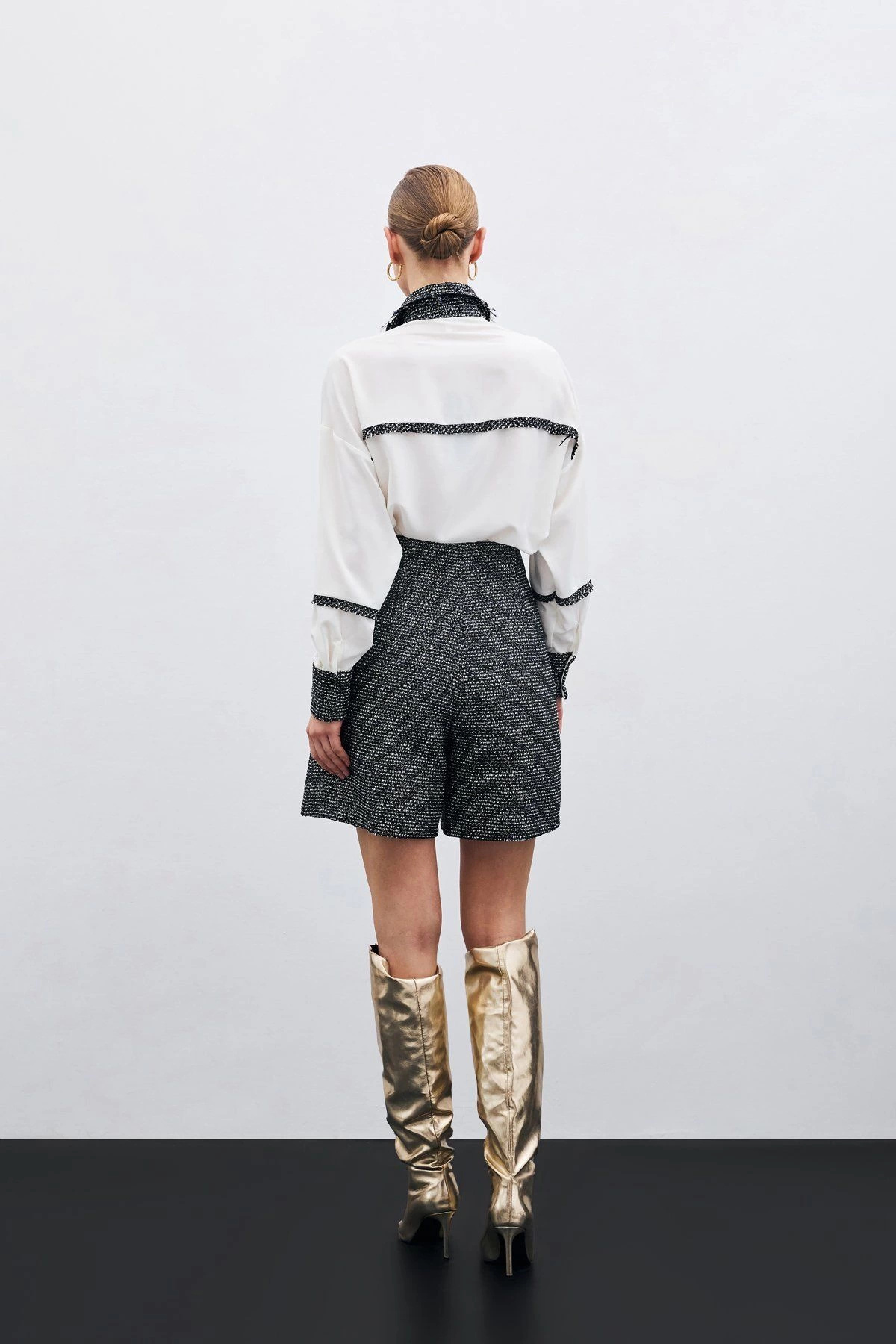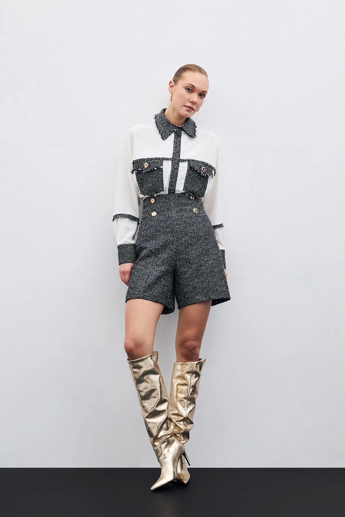 Yüksek bel, yan fermuarlı, gold süs düğmeli, iç astarlı, tüvit şort.