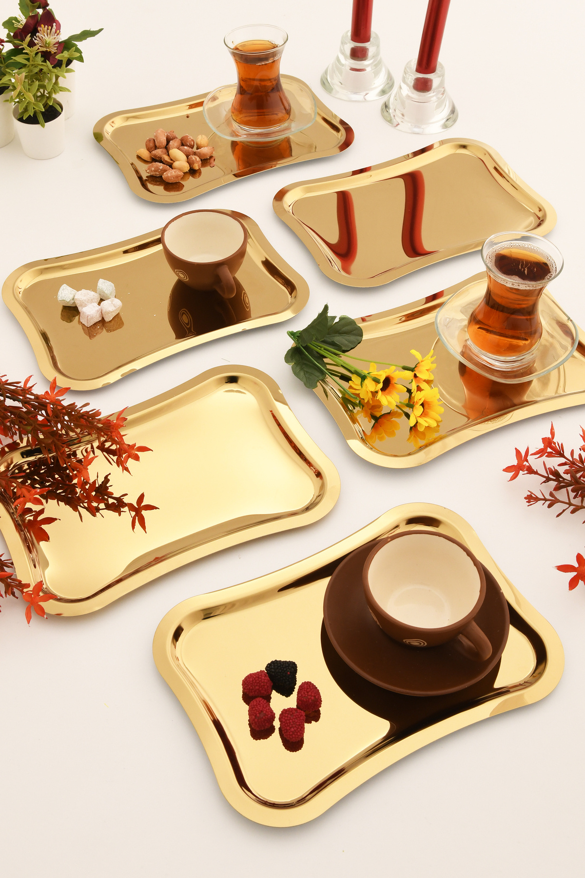 -6 adet sunum tepsisi, kahve, çay veya diğer ikramlıklarınızı rahatça servis etmenize olanak tanır.