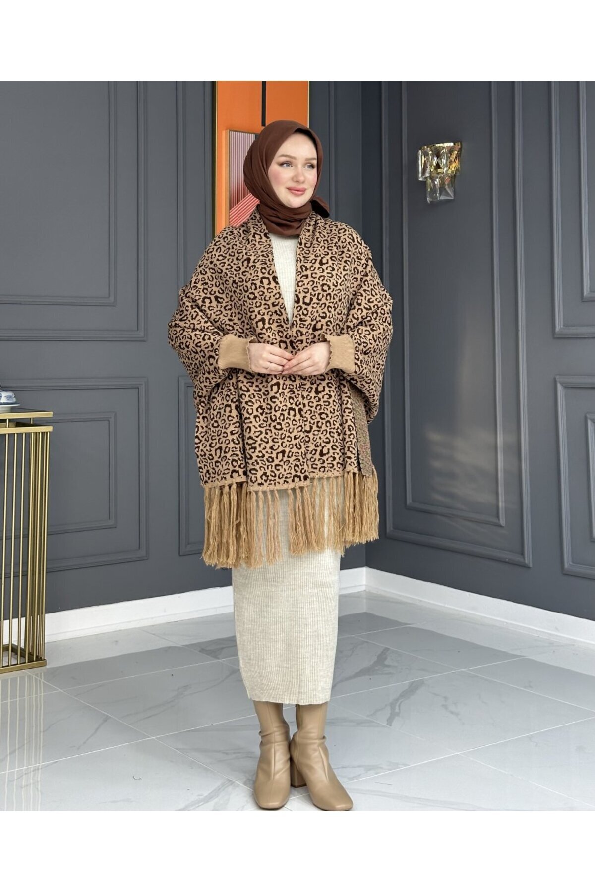 - Leopar desenleriyle süslenmiş, şıklığı ve rahatlığı bir arada sunan panço modelidir.