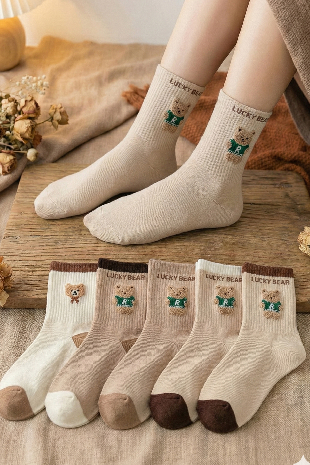 - Beş çift Bear desenli kadın çorap, evde rahatlıkla giyebileceğiniz şık ve eğlenceli bir aksesuar.