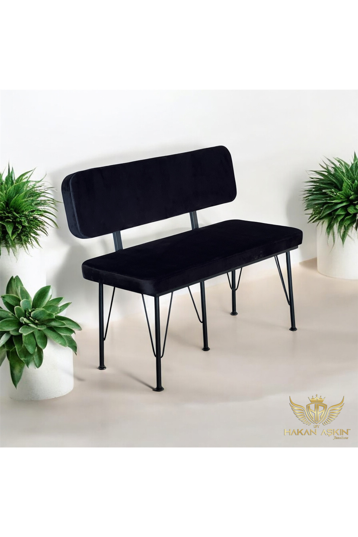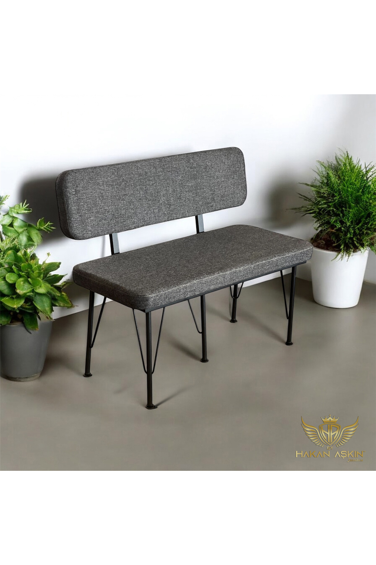 43x100 cm Modern ve country stilini bir arada sunan siyah metal ayaklı metal alt kasalı keten antrasit bench bank, mekanınıza şıklık katar