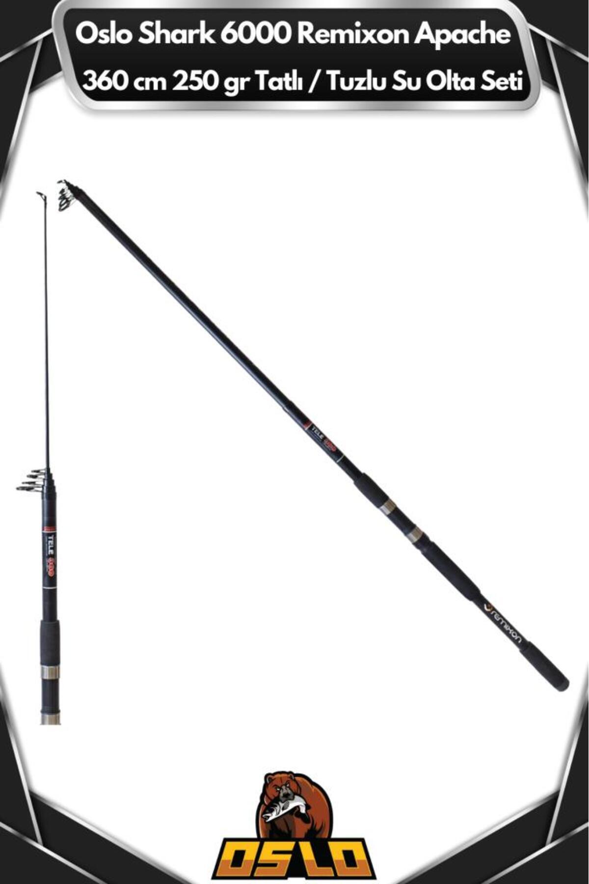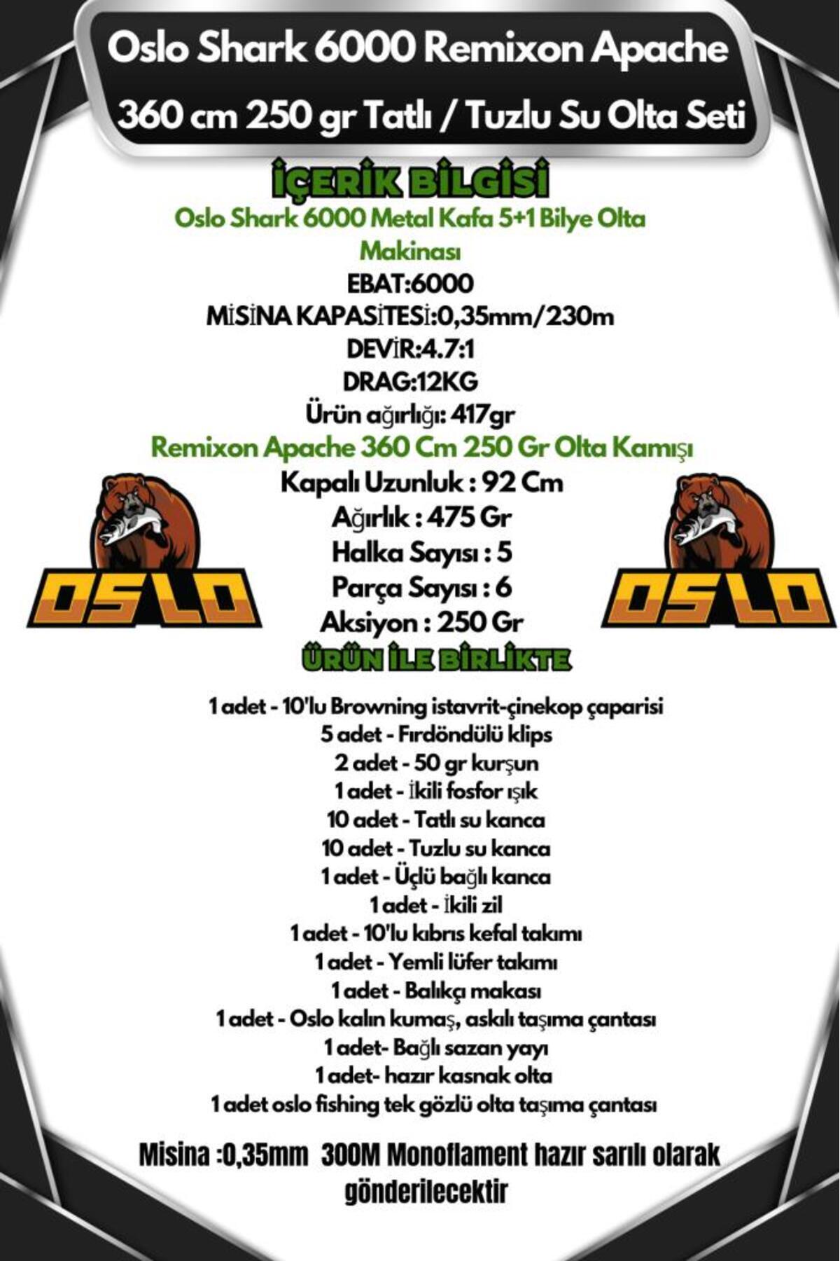 Oslo Shark 6000 Remixon Apache 360cm 250gr Tatlı/Tuzlu Su Olta Seti Oslo Shark 6000 Metal Kafa 5+1 Bilye Olta MakinasI EBAT:6000 MİSİNA KAPASİTESİ:0,35mm/230m DEVİR:4.7:1 DRAG:12KG Ürün ağırlığı: 417gr Remixon Apache 360 Cm 250 Gr Olta Kamışı Kapalı Uzunluk : 92 Cm Ağırlık : 475 Gr Aksiyon : 250 Gr Parça Sayısı : 6 Halka Sayısı : 5 Ürün İle Birlikte