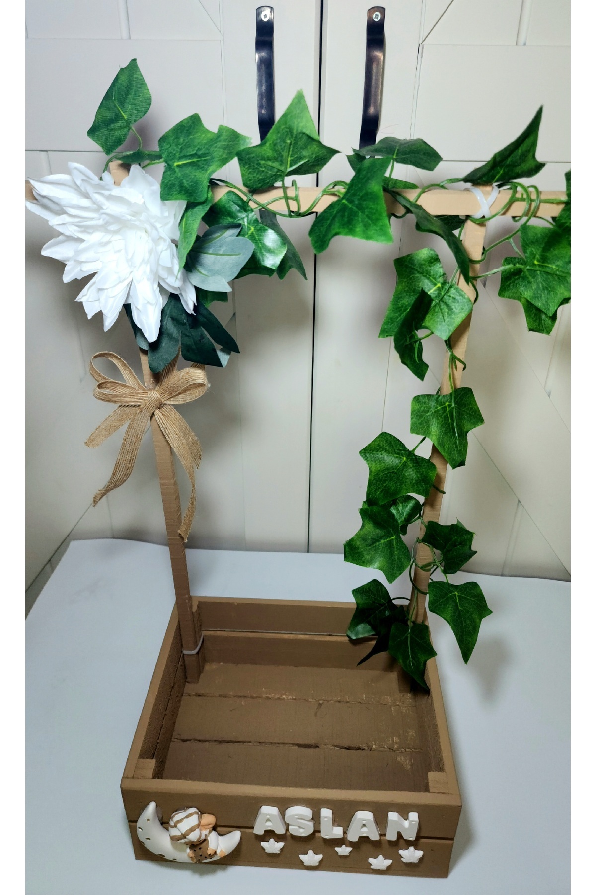 Sepetin yan tarafında sarmaşık ve beyaz bir çiçek detayı bulunmaktadır, ayrıca jüt ipten bir fiyonk ile doğal bir dokunuş sağlanmıştır.
