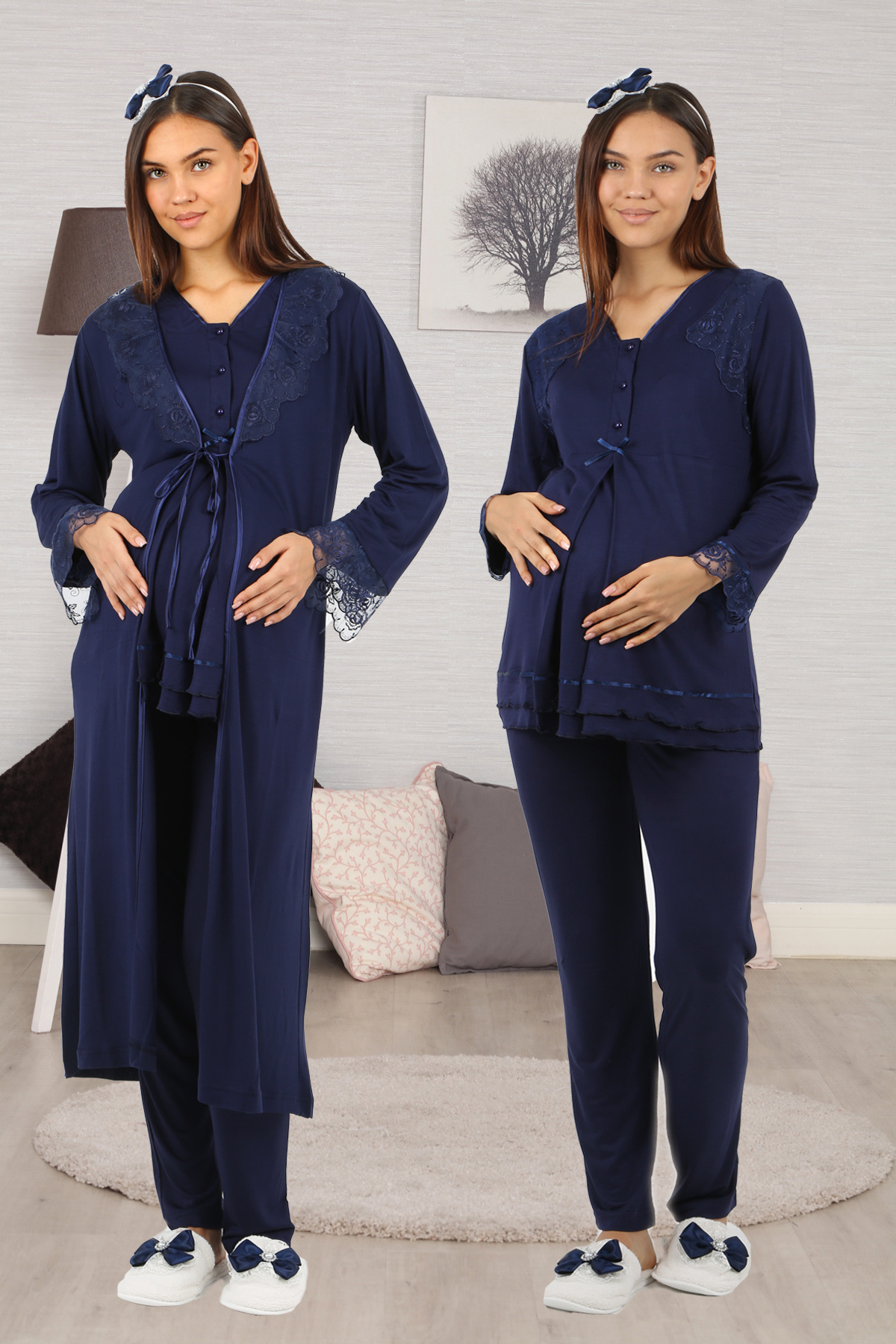 Lacivert Dantel Sabahlıklı Lohusa Pijama Takımı Effortt